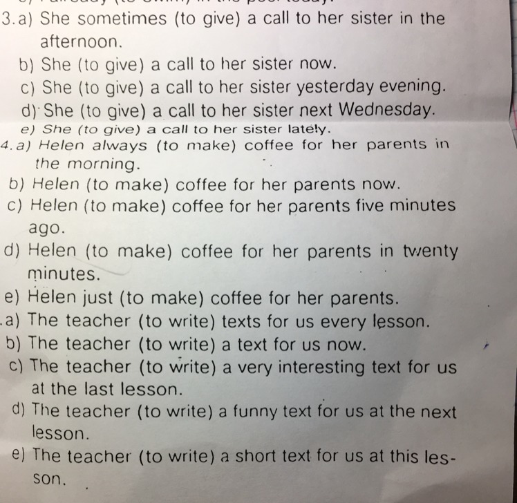 Иногда она (чтобы дать) позвонить своей сестре днем. Би Она (чтобы дать) вызов своей сестре сейчас. c) Она (чтобы дать) звонок своей сестре вчера вечером. d) Она (чтобы дать) позвонить своей сестре в следующую среду, чтобы она дала) позвонить ее сестре tatety a) Хелен всегда (чтобы сделать) кофе для ее парениса утром b) Хелен (чтобы сделать кофе для своих родителей) c) Хелен (чтобы сделать кофе для своих родителей пять минут назад d] Хелен (чтобы сделать) кофе для ее родителей через двадцать минут. e) Хелен просто (чтобы сделать) кофе для своих родителей. а) Учитель (чтобы писать) тексты для нас каждый урок. б) Учитель (чтобы написать) текст для нас сейчас. c) Учитель (чтобы написать) очень интересный текст для нас на последнем уроке урок. d) Учитель (чтобы написать) забавный текст для нас на следующем e) Учитель (чтобы написать) короткий текст, который нам нужен этот лес