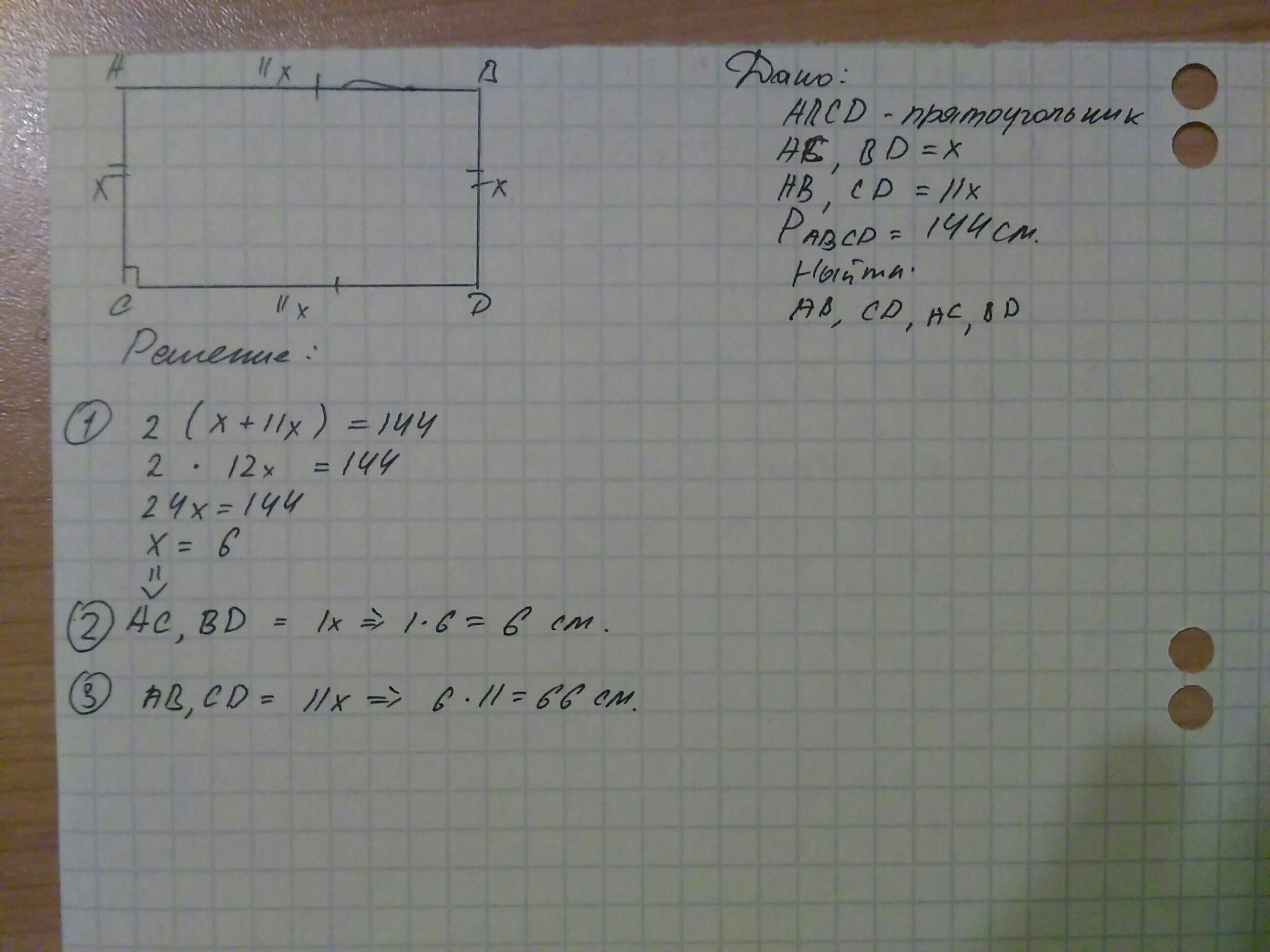 Одна из сторон прямаугольника в 11 раз меньше другой. Найдите стороны прямаугольника, если его периметр равен 144 см.
