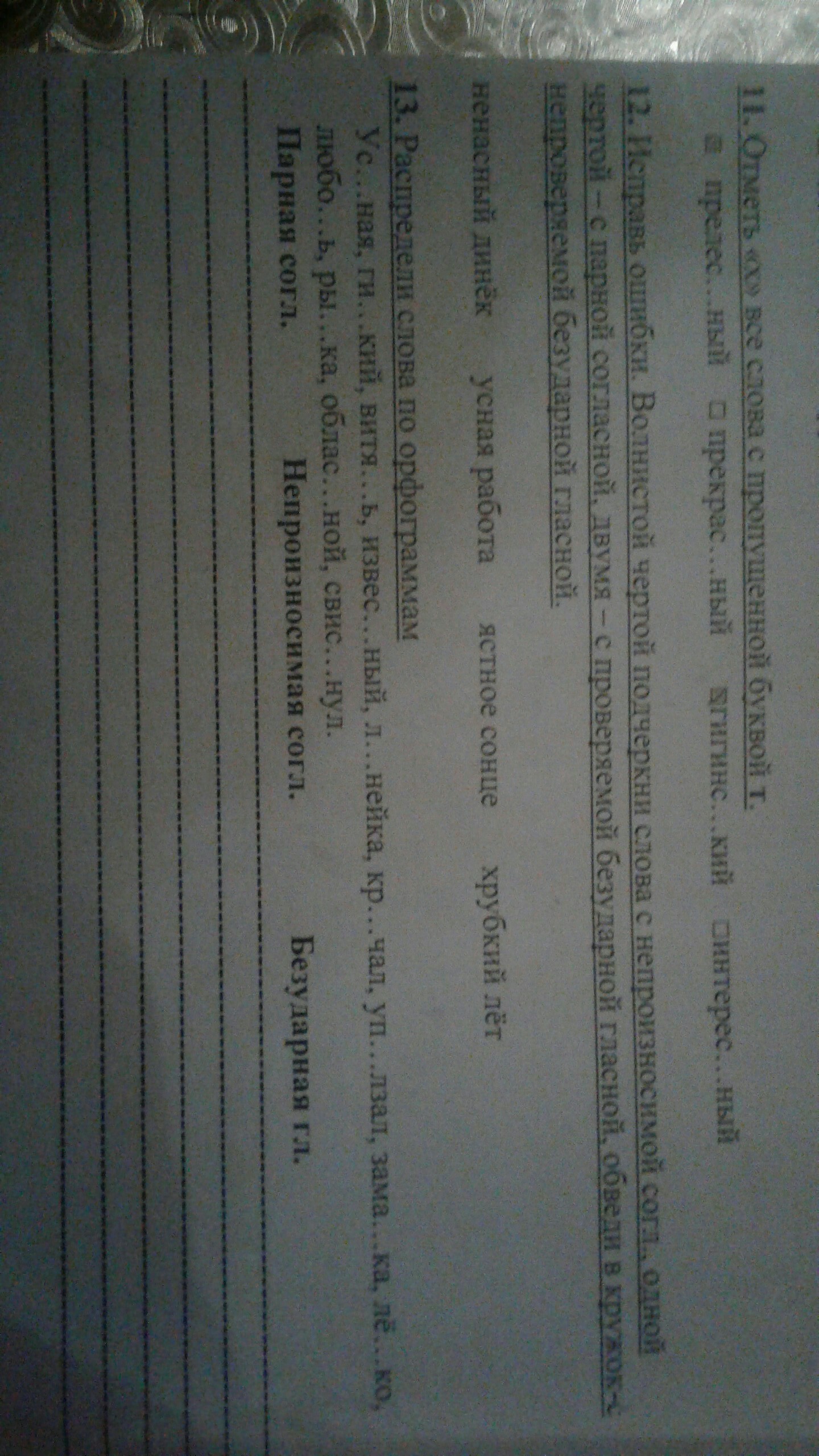 12задание ненастный(неипроизносимая согласная) денёк ( проверяемая гласная) устная непроизнасимая согласная) работа ясное(непроизносимая) солнце(непроизнасимая) хрупкий(парная) лёд (парная)