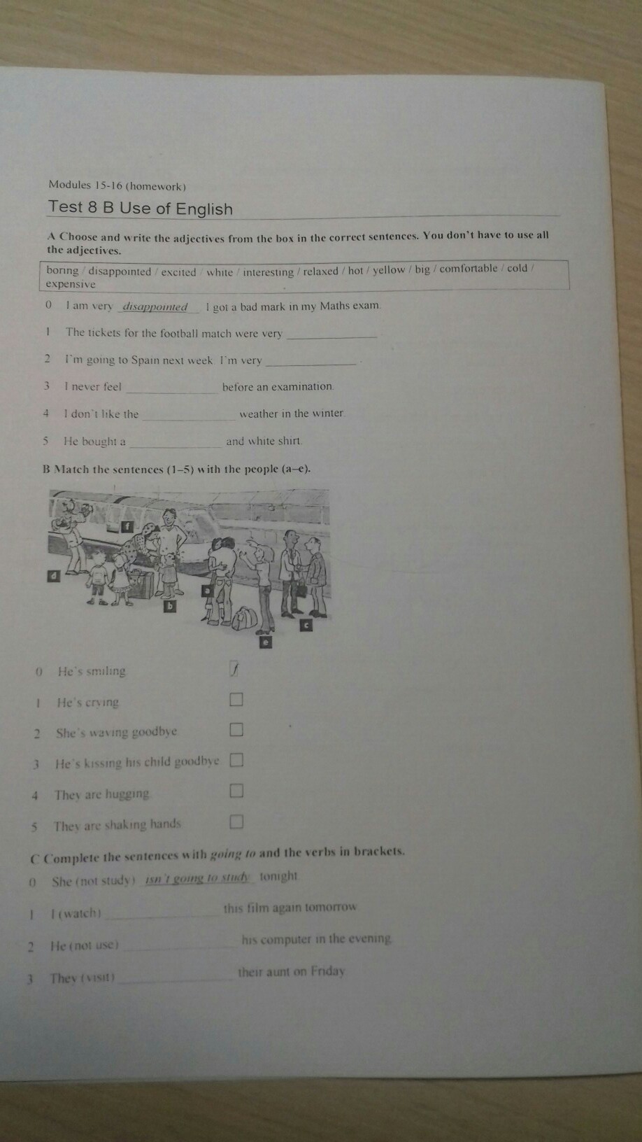 0.disoppointed, 1.expensive, 2.excited, 3.relaxced, 4.cold, 5.yellow; - 0.f, 1.b, 2e, 3d, 4a, 5c; - 1. I'm going to watch... 2. He is not going... 3. They are visiting