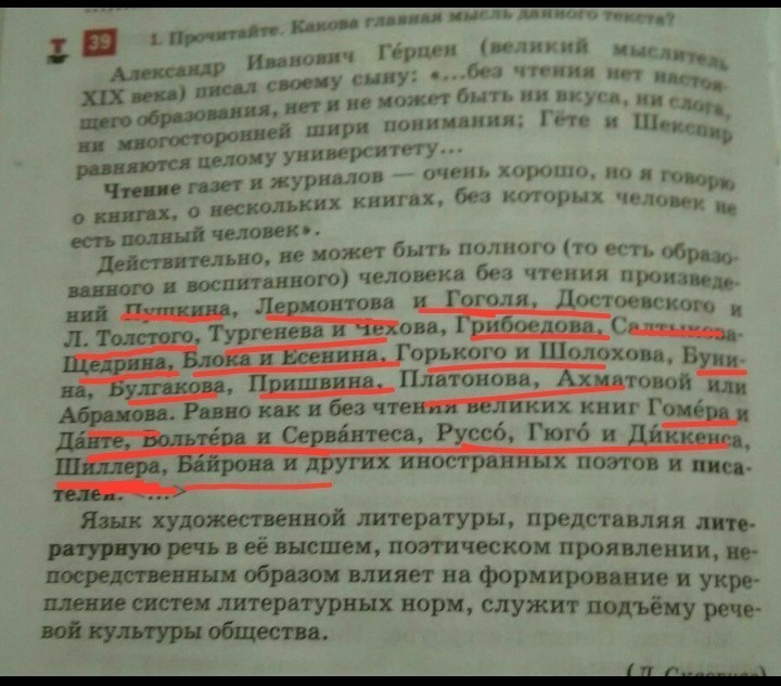 Александр Иванович Герцен, Гёте, Шекспир, Пушкин, Лермонтов, Гоголь, Достоевский, Л. Толстой, Тургенев, Чехов, Грибоедов, Салтыков-Щедрин, яблок, Есенин, Шолохов, Горький, Бунин, Булгаков, Пришвин, Платонов, Ахматова, Абрамов, Гомер, Данте, Вольтер, Сервантес, Руссо, Гюго, Диккенс, Шиллер, Байрон