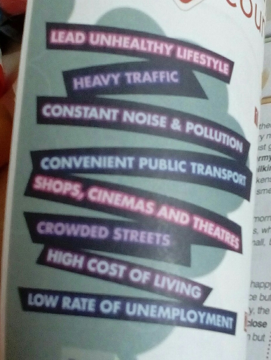 1) liːd ʌnˈhɛlθi ˈlaɪfˌstaɪl. 2)ˈhɛvi ˈtræfɪk . 3)ˈkɒnstənt nɔɪz pəˈluːʃən.4)kənˈvi: ˈpʌblɪk ˈtrænspɔːt.5) ʃɒps ˈsɪnəməz ænd ˈθɪətəz . 6)ˈkraʊdɪd striːts . 7)hai kɒst ɒv ˈlɪvɪŋ . 8)ləʊ reɪt ɒv ˌʌnɪmˈplɔɪmənt.