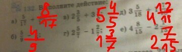А)5÷17 +3÷17=8÷17 Б)5÷9-1÷9=4÷9 В)2 3 +3 1 =5 4 5 5 5 Г) 2 5 - 1 2 = 1 3 7 7 7 Д) 3 5 + 1 7 = 4 13 18 18 18 Е)4 8 - 2 1 =2 7 15 15 15