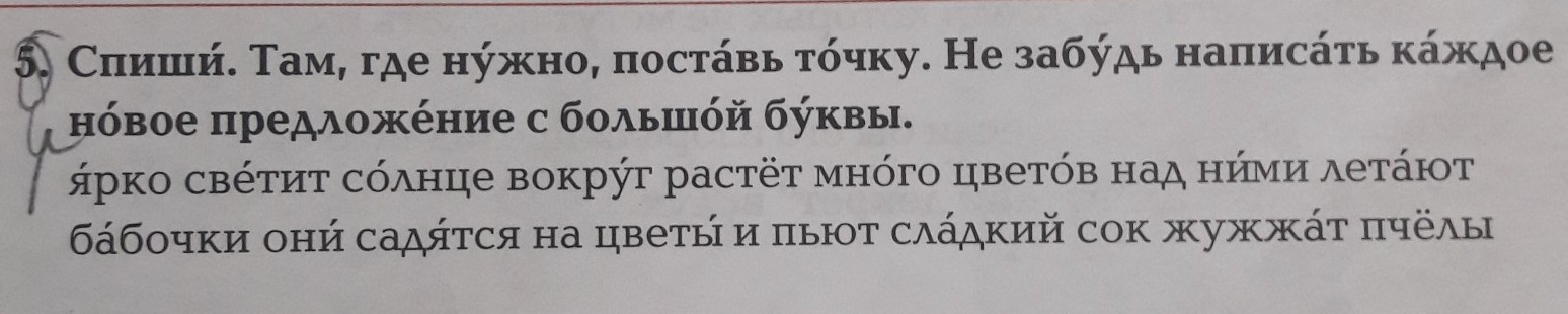 Ярко светит солнце. Вокруг растёт много цветов. Над ними летают бабочки. Они садятся на цветы и пьют сладкий сок. Жужжат пчёлы.