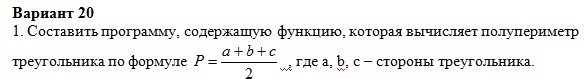 1. Составить программу, содержащую функцию, которая вычисляет полупериметр треугольника по формуле Герона , где а, b, c – стороны треугольника. В С++