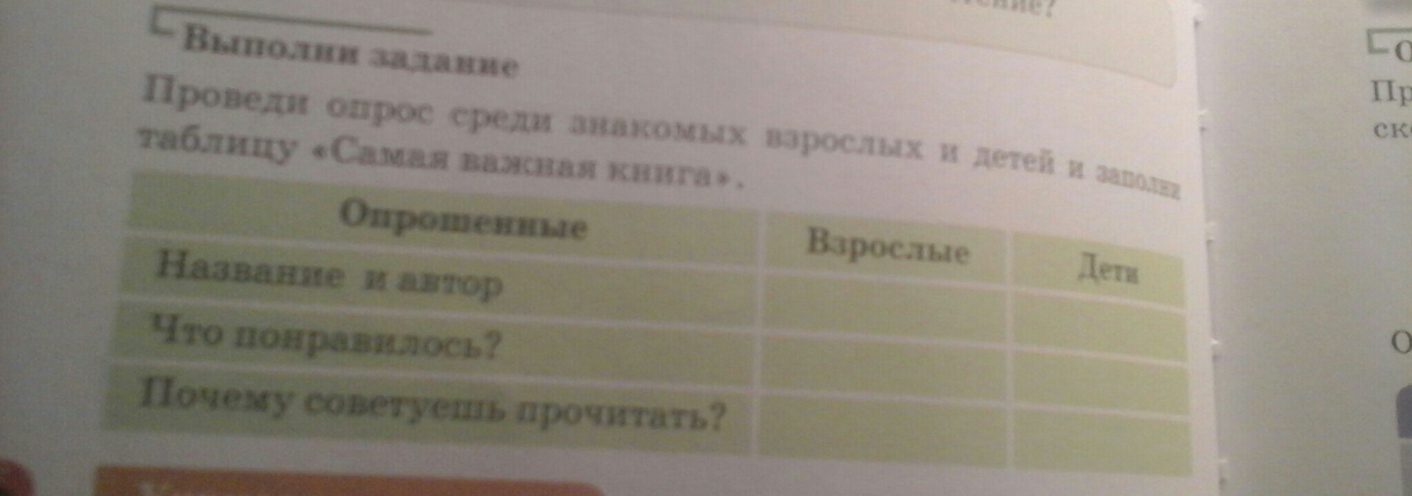 СРОЧНО проведи опрос среди знакомых взрослых и детей и заполни таблицу самая важная книга