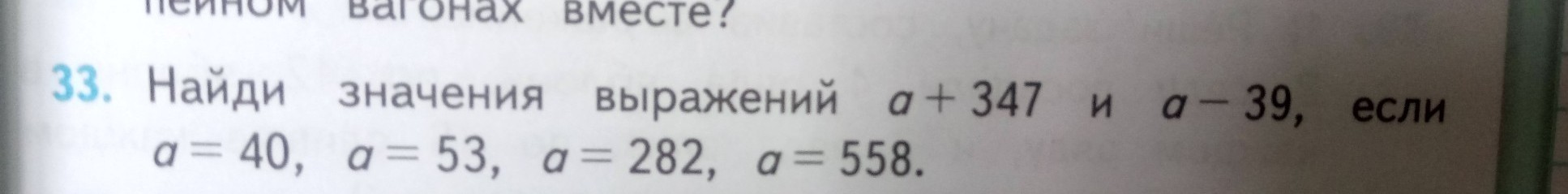 a+347 при a=40 a+347=40+347=387 при a=53 a+347=53+347=440 при a=282 a+347=282+347=629 при a=558 a+347=558+347=905 a-39 при a=40 a-39=40-39=1 при a=53 a-39=53-39=14 при a=282 a-39=282-39=243 при a=558 a-39=558-39=519