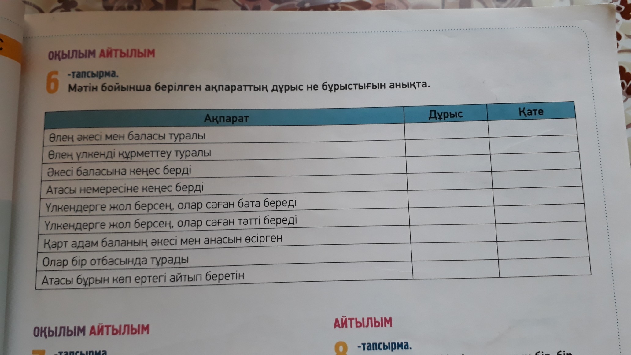 нужно прочитать текст который дан выше наверное,и ответить истина это или ложь ,дұрыс-истина,қате-ложь.