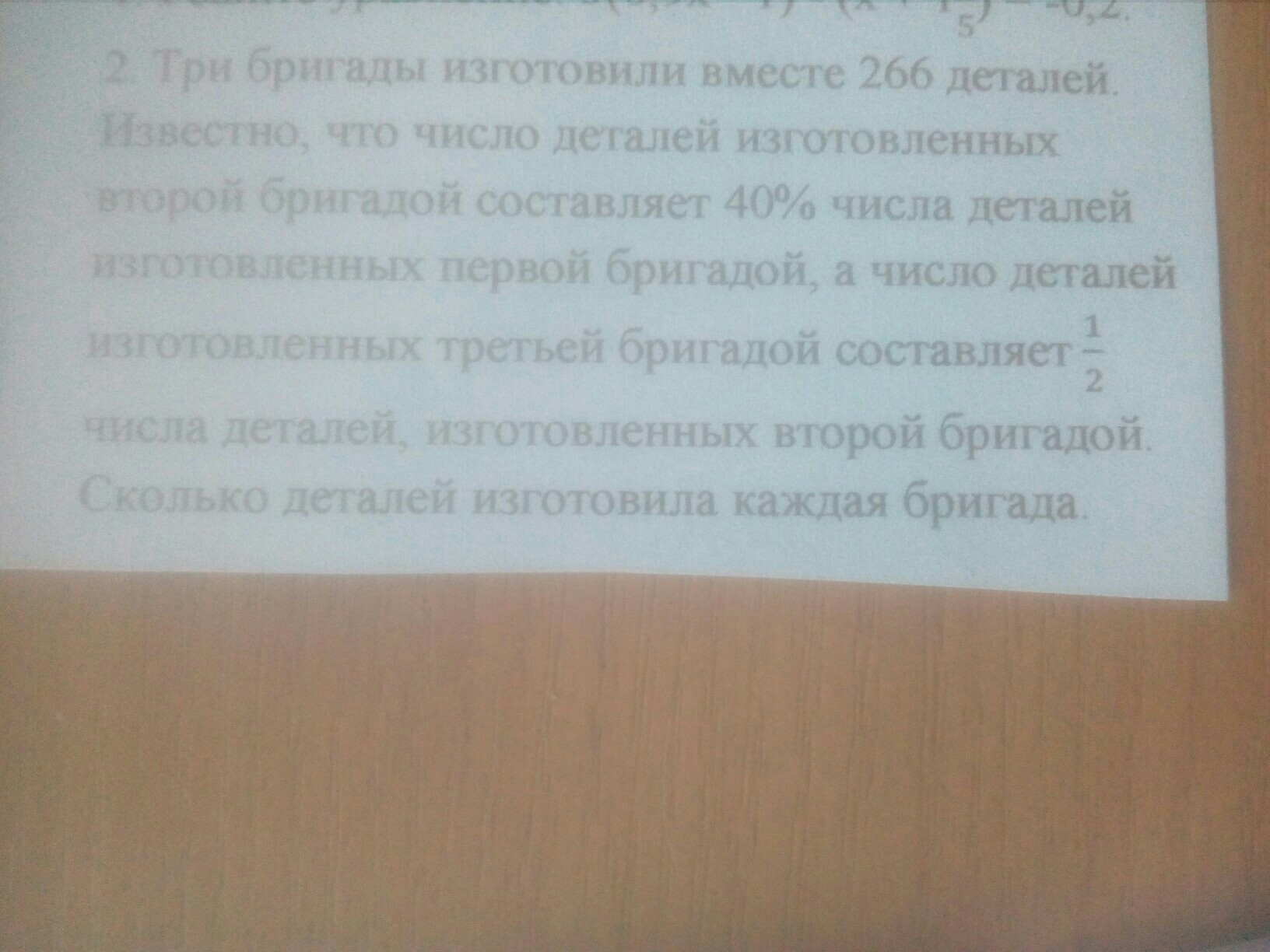 Примем за х количество деталей изготовленных первой бригадой. Вторая бригада изготовила в 4 раза больше, значит 4*х. А третья бригада на пять больше чем вторая 4*х+5. Всего 266 деталей.