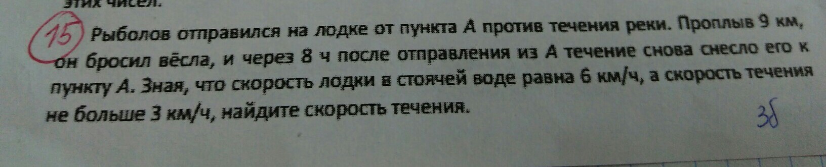 Рыболов отправился на лодке от пункту А против течения реки. Проплыв 9 км, он бросил весла, и через 8 ч после отправления из А течение снова снесло его к пункту А. Зная, что скорость лодки в стоячей воде равна 6км/ч, а скорость течения не больше 3км/ч, найдите скорость течения.