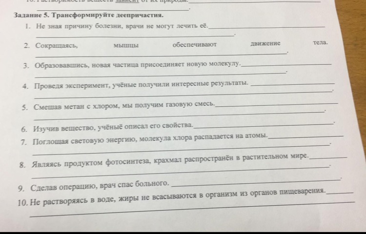 Может вот так - 1. Врачи не могут лечить болезнь не зная ее причины. 2.Движения тела обеспечивают сокращения мышц. 3. Новая частица образуется присоединением новой молекулы. 4. Ученые получили интересные результаты при проведении эксперимента. 5. Мы получим газовую смесь при смешивании метана с хлором. 6. Ученый описал свойства вещества после его изучения. 7. Распад молекулы хлора на атомы происходит с поглощением световой энергии. 8. Крахмал распространен в растительном мире, так как является продуктом фотосинтеза растений. 9. Врач спас больного после проведения ему операции. 10. Жиры не всасываются в организм из органов пищеварения потому, что не растворяются в воде.