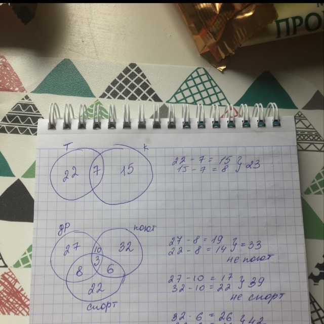 1. Каждый ученик класса побывал в театре или в кино. В театр сходили 22 человека. В кино были 15 человек. И в театре, и в кино были 7 человек. Сколько учеников в классе?