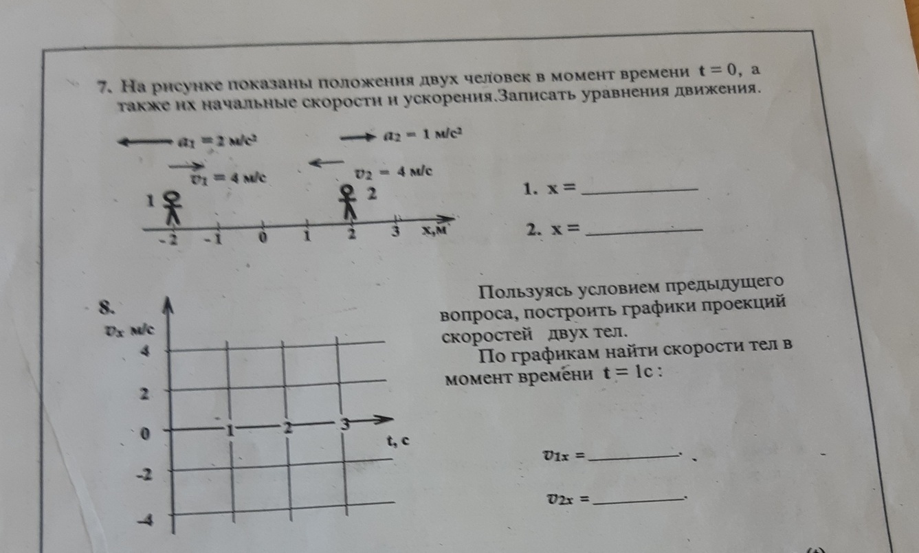 7. На рисунке показаны положения двух человек в момент времени t = 0, а также их начальные скорости и ускорения.