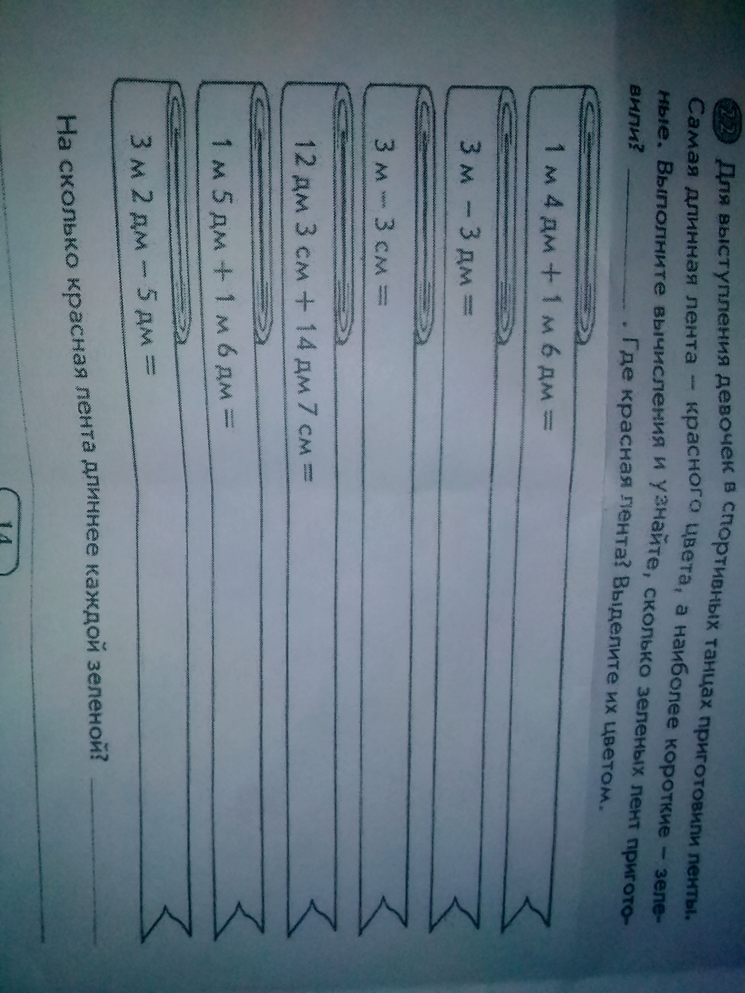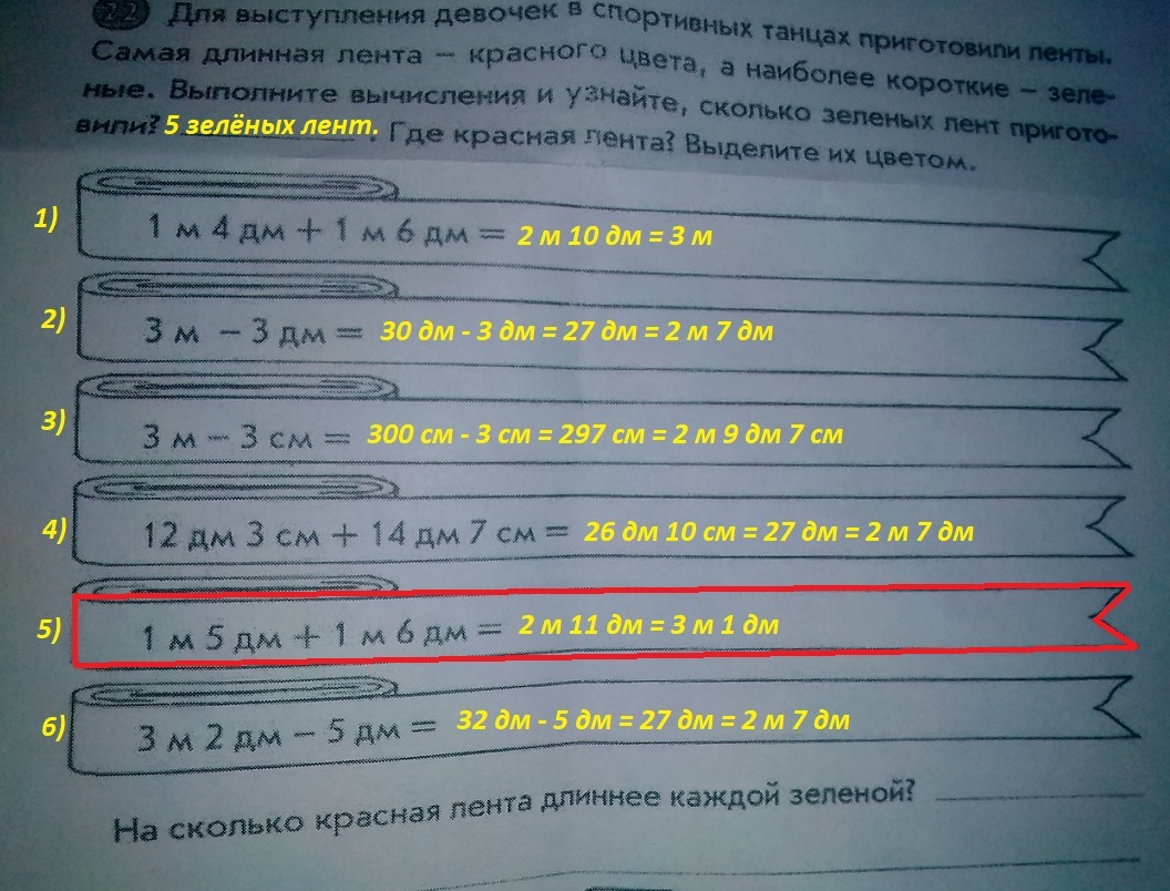 1) 3 м 1 дм - 3 м = 1 дм - на столько красная лента длинее зелёной ленты №1