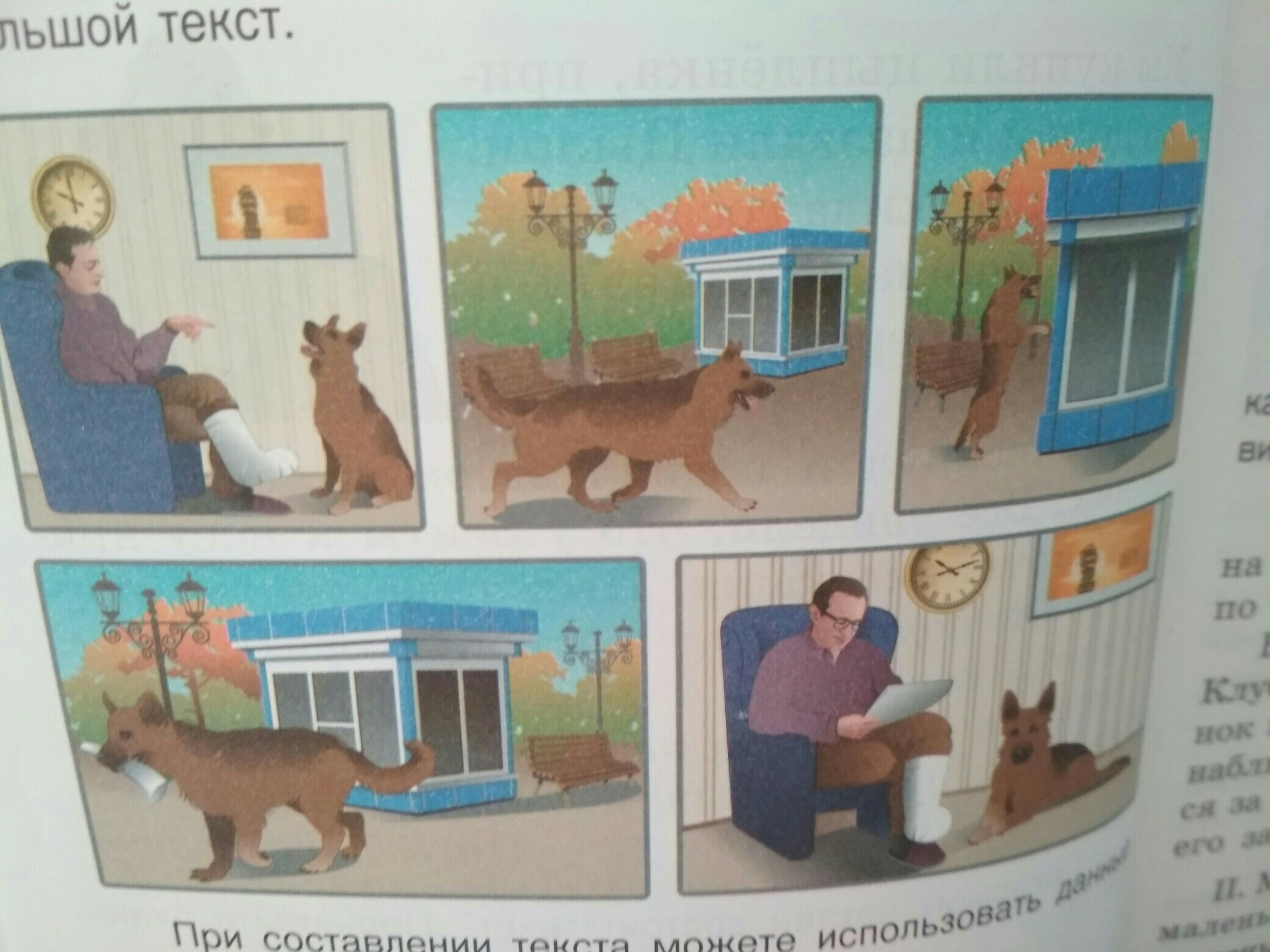 Владимир Петрович сидит в кресле со сломанной ногой. Он послал собаку в газетный киоск, так как сам он сходить не может. Собака отправилась за газетой своему хозяину. Около газетного киоска стояли две лавочки. Продавец продал товар собаке. Собака взяла газету и побежала к своему хозяину. Хозяин очень обрадовался.
