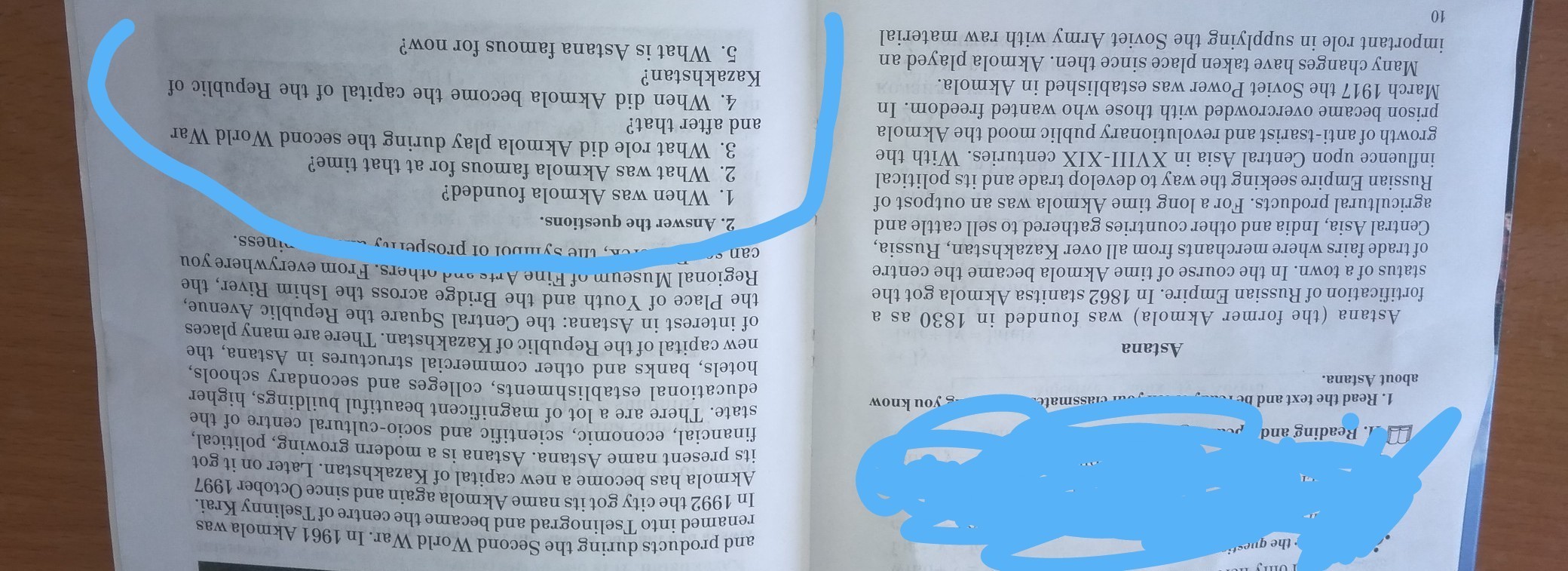 Школьные Знания.com Какой у тебя вопрос? aidanatasimova75 5 - 9 классыАнглийский язык 5+3 б 1.When was Akmola founded? 2.What Was Akmola famous for at that time? 3.Whant role did Akmola play during the Second World War ahd after that? 4.When did Akmola become the capital of the Republic of Kazakhstan? 5.what is Astana famous for now? Реклама Отметить нарушение Oudin1 15.03.2014 Ответы и объяснения galina572319 Galina572319 Старший Архивариус 1. Когда был основан город Акмола? -It was founded in 1862. 2. Чем Акмола был известен в то время? - It was a small fortress. (крепость) 3. Kакую роль сыграл город Акмола во время Второй мировой войны и после неё? It played an important role. 4. Когда Акмола стал столицей Республики Казахстан? It became the capital of the Republic of Kazakhstan in May, 1998. 5. Чем Астана славится сейчас? It is a big industrial, political, economic and cultural centre and the capital of the Republic of Kazakhstan.