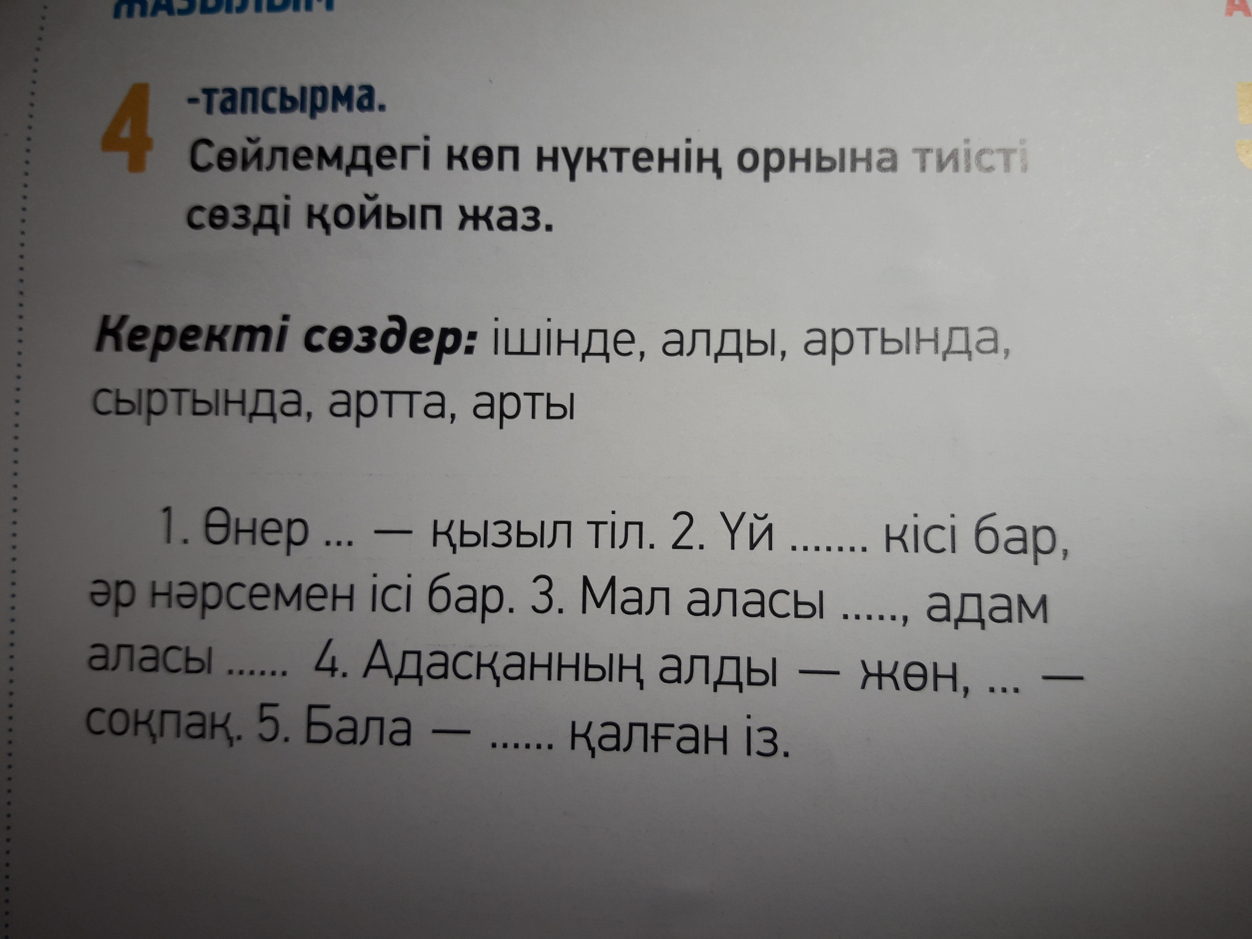 1.Өнер алды--қызыл тіл.2. Үй артында кісі бар әр нәрсемен ісі бар. 3.Мал аласы сыртында,адам аласы ішінде.4.Адасқанның алды--жөн, --арты соқпақ.5.Бала --артта қалған із.