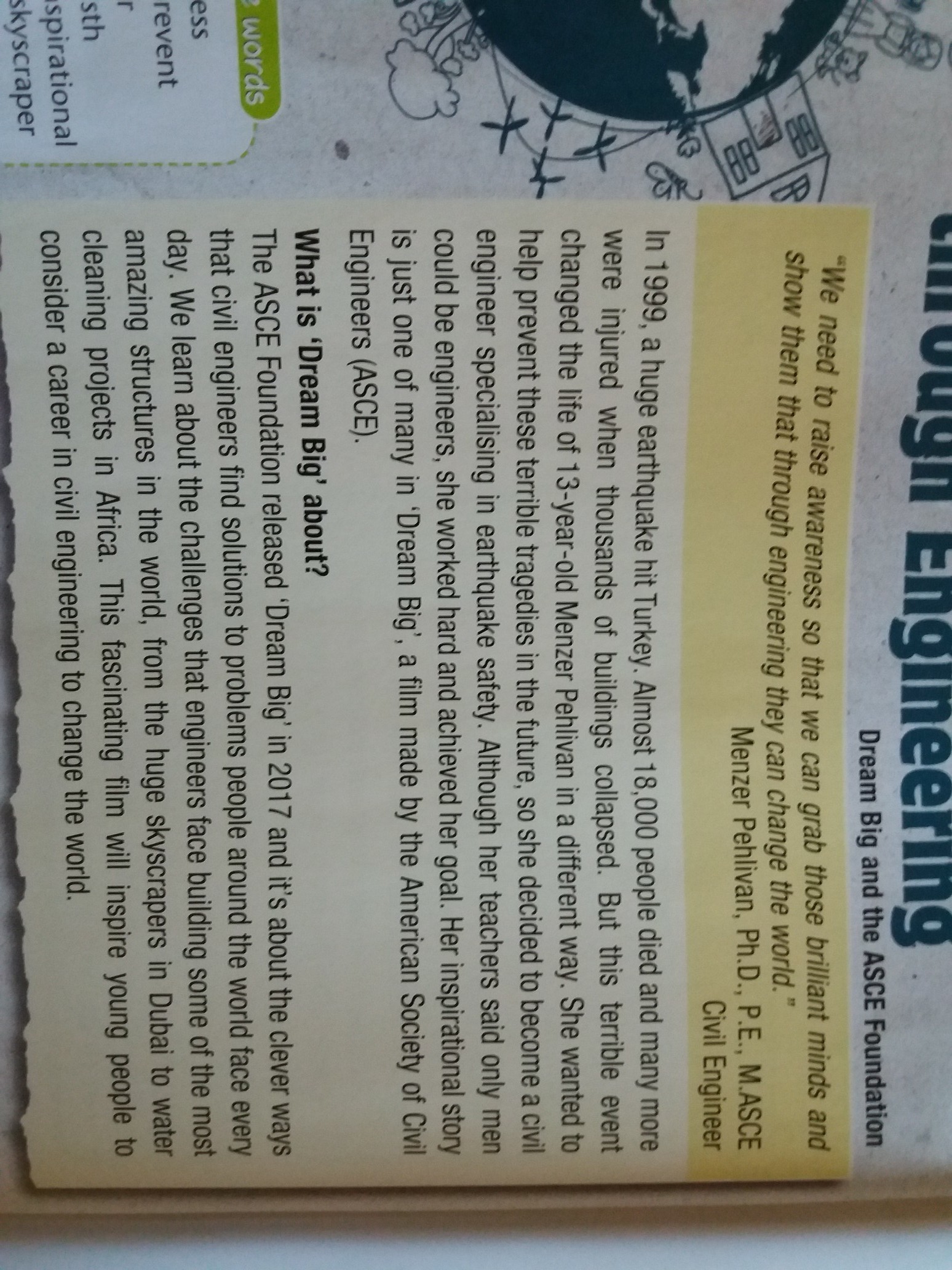 В 1999 году, сильное землетрясение потрясло Турцию. Почти 18000 человек погибли и намного больше были ранены при обрушении построек. Это ужасное событие кардинально изменило жизнь 13 летней Мензер Пехливан. Она хотела помочь предупредить ужасные трагедии подобные этим в будущем, поэтому она решила стать гражданским инженером, специализирующемся на безопасности. Несмотря на то, что её учителя говорили, что только мужчины могут быть инженерами, она упорно трудилась и добилась своей цели. Её вдохновляющая история лишь одна из многих в фильме "Большая мечта", который был создан Американским Обществом Гражданских Инженеров(АОГИ).