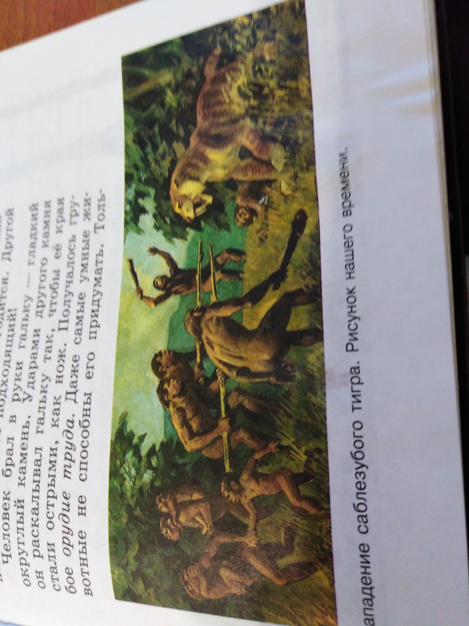 На рисунке видны несколько видов человеческой рассы, охотясь на тигра. В руках они держат деревянные орудия труда. Преимущественно это заточенные копья.