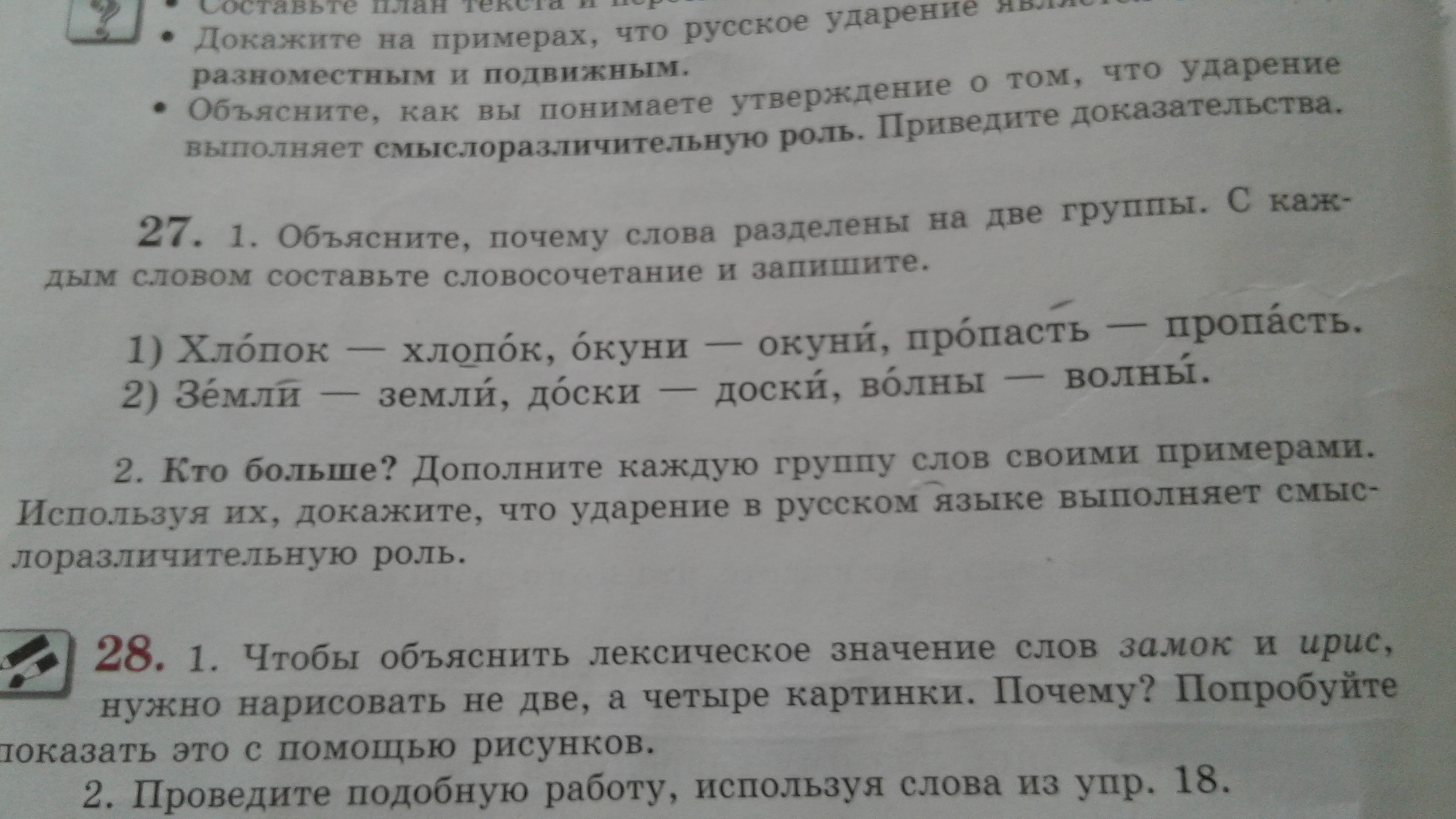 в первом там каждая пара имеет 2 разных слова например хлопок ( с ударением на 1 лог) это материал, а хлопок ( с ударением на 2 слог) это звук хлопка человека