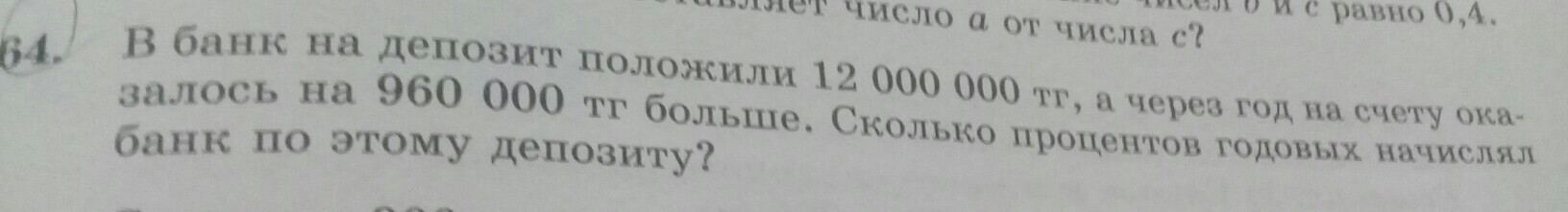 в банк на депозит положили 12 000 000 тг а через год на счету оказалось на 960 000 больше.Сколько процентов годовых начислял банк по этому депозиту