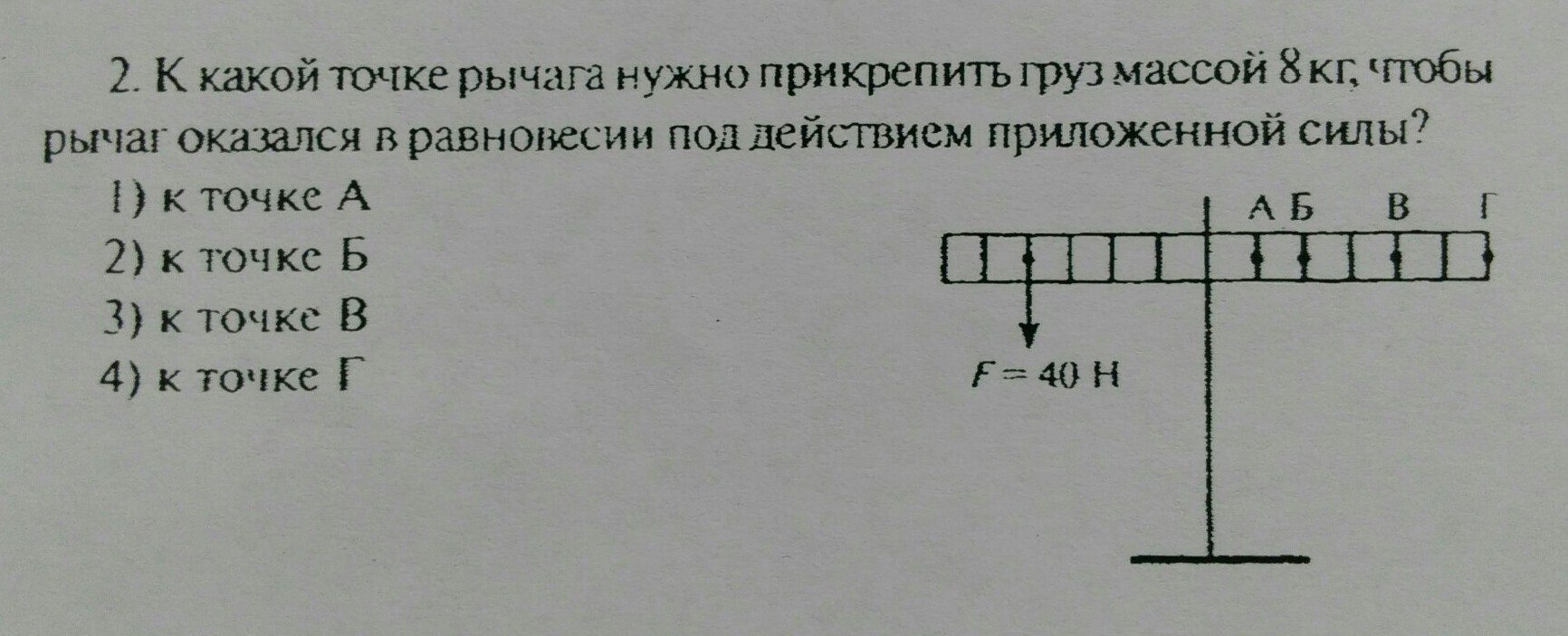 Ответ: чтобы рычаг находился в равновесии. нужно груз массой 8 кг подвесить к точке Б (вариант № 2).