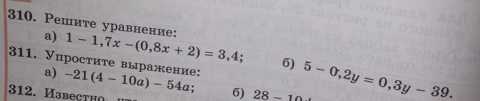 а) 1-1,7х-08х-2=3,4 -2,5х=4,4 х=-1,76 б)5-0,2у-0,3у=-39 -0,5у=-44 у=88