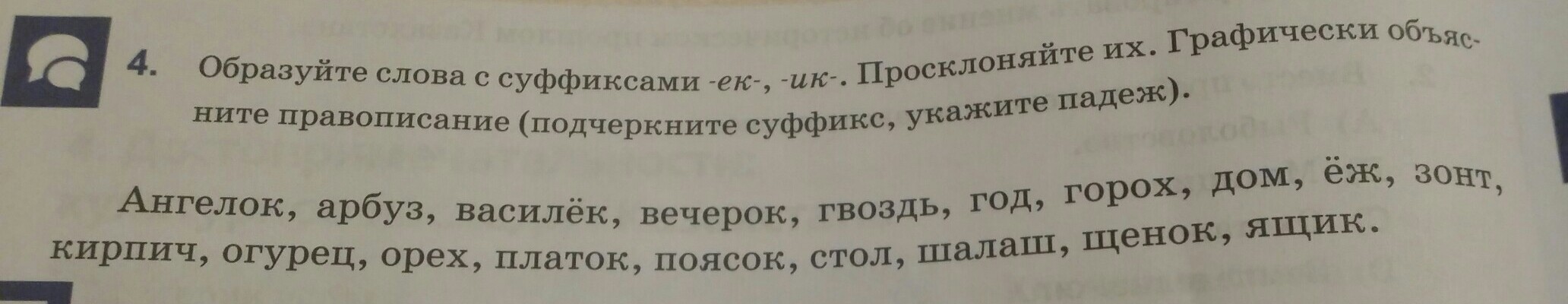 1. Ангелок- ангелочек, арбуз- арбузик, василёк- василёчек, вечерок- вечерочек, гвоздь-гвоздик, год-годик, горох- горошек, Дом - домик, ёж - ёжик, зонт - зонтик, кирпич - кирпичек, огурец - огуречик, орех - орешик, платок - платочек, поясок поясочек , стол - столик, шалаш - шалашик, щенок - щеночек, ящик - ящичек.