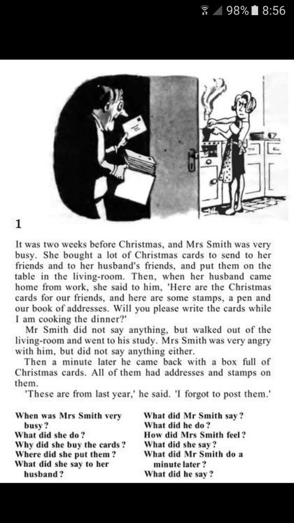 Это было за две недели до Рождества, и миссис Смит была очень занята. Она купила много рождественских открыток, чтобы отправить её друзьям и к друзьям ее мужа, и положили их на стол в гостиной. Потом, когда пришел ее муж домой с работы, она сказала ему: " Вот Рождественские открытки для наших друзей, а вот несколько марок, ручка и наша адресная книга. Пожалуйста, заполняй их в то время как я буду готовить ужин. Мистер Смит ничего не сказал, но вышел из гостиной и пошел к себе в кабинет. Миссис Смит была очень зла, также как и он, но ничего не сказала. Через минуту он вернулся с коробкой, полной Рождественских открыток. Все они имели адреса и штампы на них.
