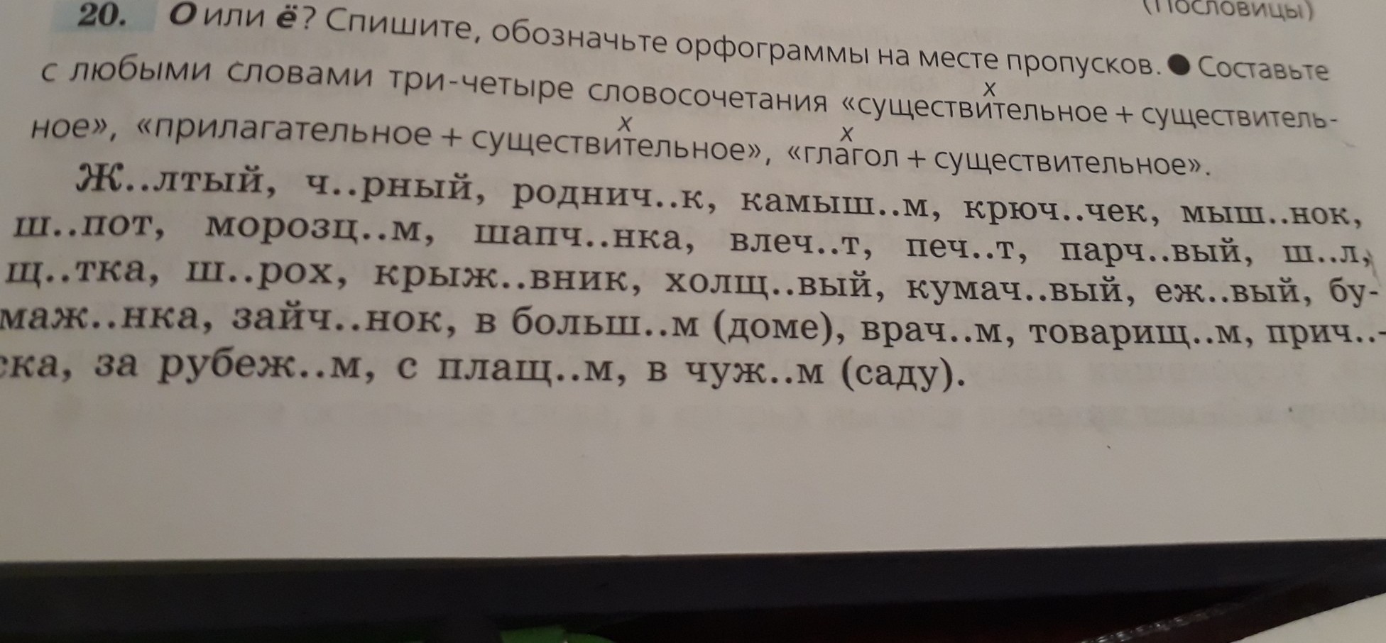 Желтый цветок, черный кот, чистый родничок, ударился камышом, кривой крючочек, маленький мышонок, шепот во тьме, шорох с кустов, вкусный крыжовник, холщовый мешок, кумачовый цвет, ежовый кактус, бумаженка от тетради, белый зайчонок, в очень большом (доме), стать врачом, быть товарищем, хорошая причёска, отдыхать за рубежом, ходить с плащом, в чужом месте