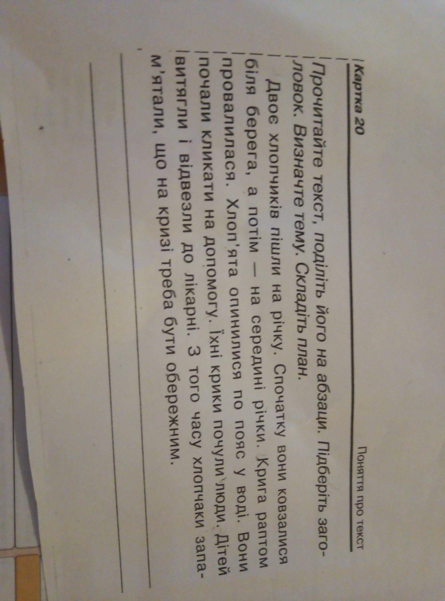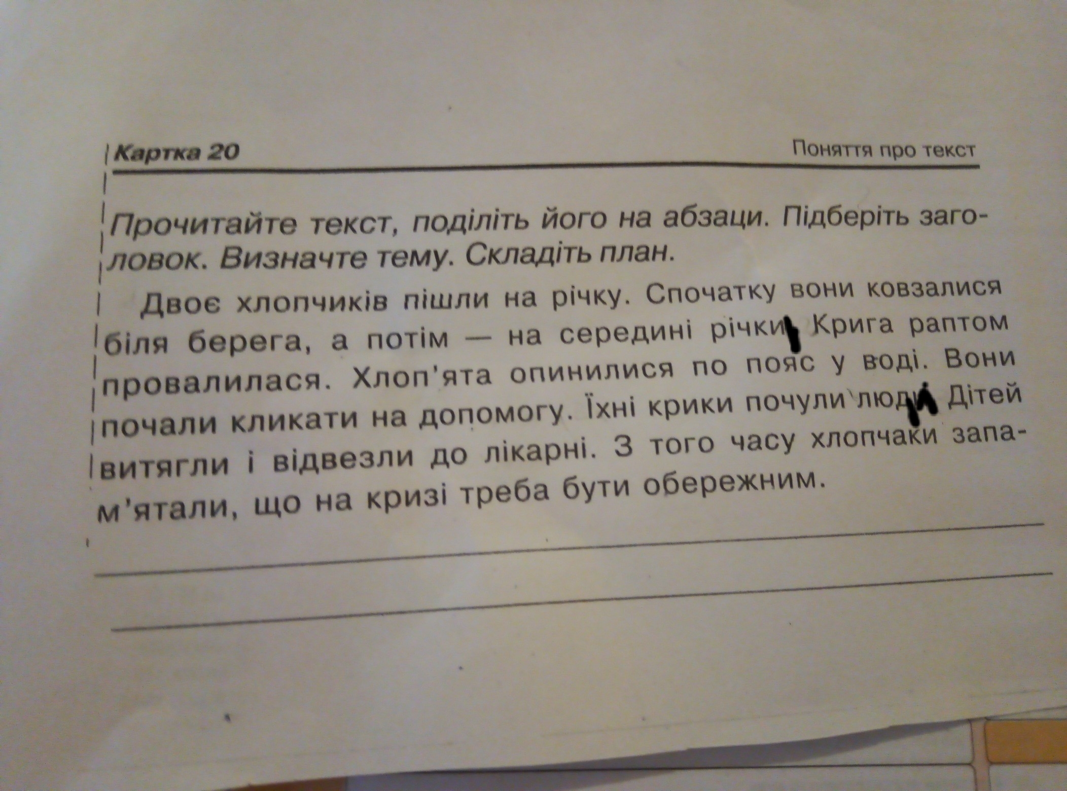 Чёрные точки это абзацы Заголовок:Невдалий похід на річку Тема-будьте обережні на льоду План: 1Веселе ковзання 2Обвал криги 3Порятунок