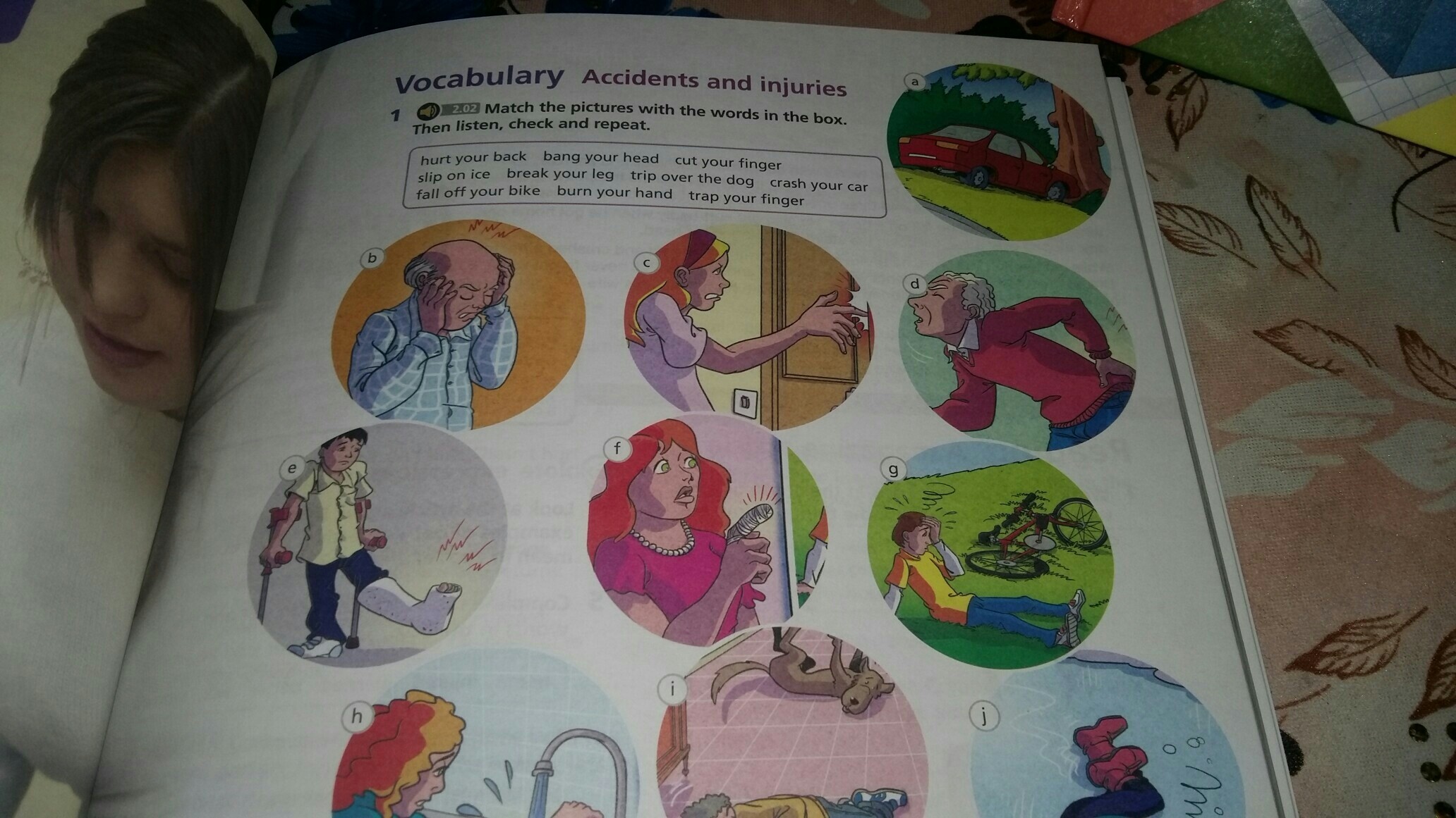 B. Bang your head E.break your leg h.burn your hand C.trap your finger i.trip over the dog A.crash your hand d.hurt your back g.fall off your bike j.slip on ice