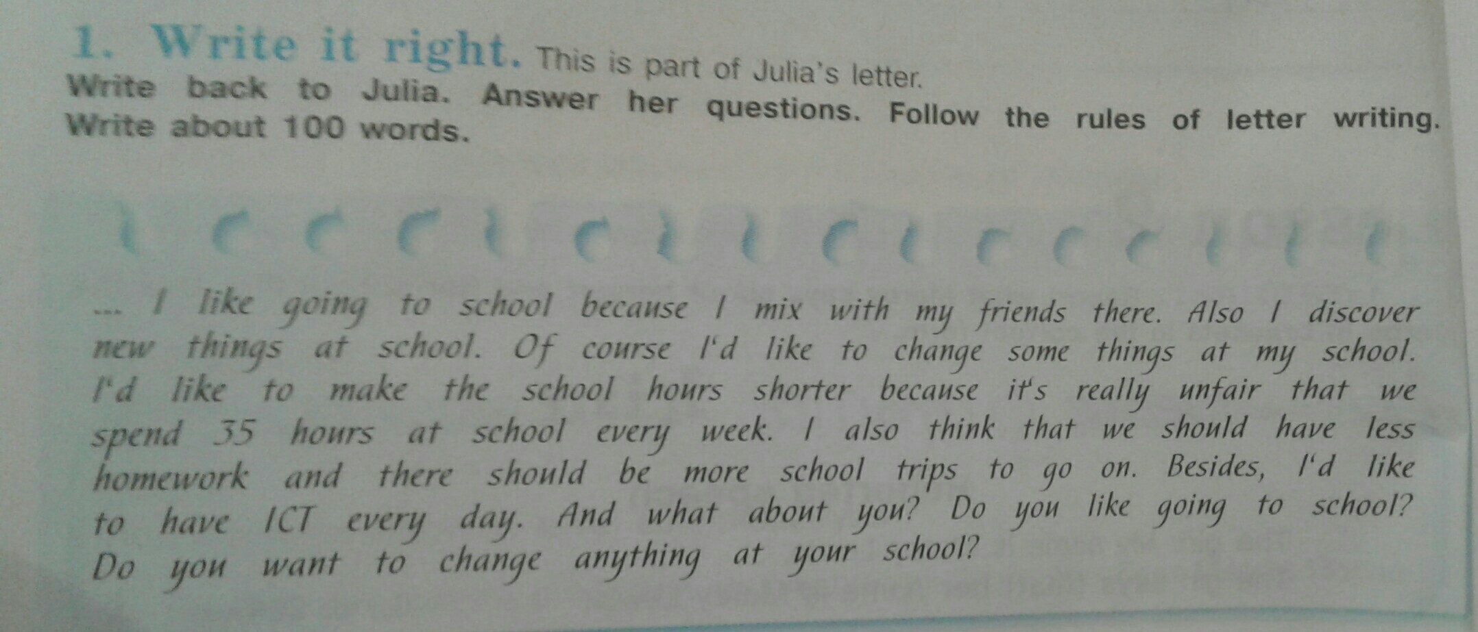 ..я люблю ходить в школу, потому что я общаюсь с моими друзьями там. Также я узнаю новые вещи в школе. Конечно мне хотелось бы изменить некоторые вещи в моей школе. Я бы хотела сделать школьные часы короче, потому что это действительно несправедливо, что мы проводим 35 часов в школе еженедельно. Я также думаю, нам следует иметь меньше домашнего задания и следует, чтобы было больше школьных поездок. Кроме того, я бы хотела чтобы урок информатики был каждый день. А что насчёт тебя? Ты любишь ходить в школу? Ты хочешь изменить что-то в своей школе?