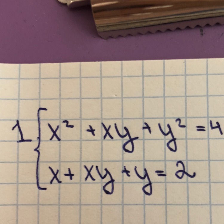 сложим уравнения: х^2+у^2+2ху+х+у=6 (х+у)^2 + (х+у) - 6 = 0 замена: х+у=t t^2 + t - 6 = 0 по т.Виета корни (-3) и (2) получилось: х+у = -3 ---> х = -у-3 подставим: -у-3 + (-у-3)у + у = 2 у^2 + 3у + 5 = 0 D=9-20<0 нет корней) х+у = 2 ---> х = 2-у подставим: 2-у + (2-у)у + у = 2 (2-у)у = 0 ---> y1 = 0 и х1 = 2 y2 = 2 и х2 = 0