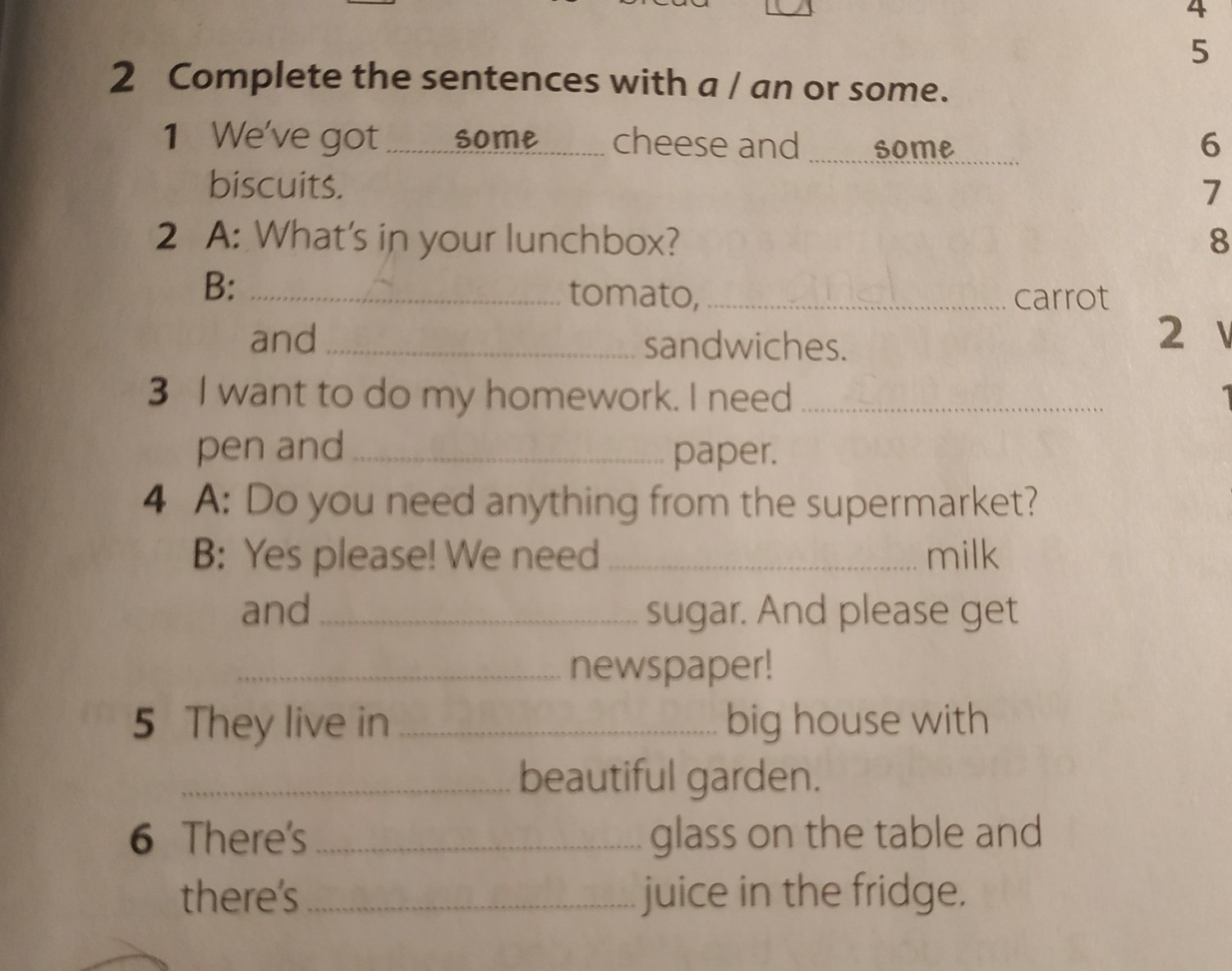 2. a, a, some. 3. a, some. 4. some, some, a. 5. a, a. 6. a, some.