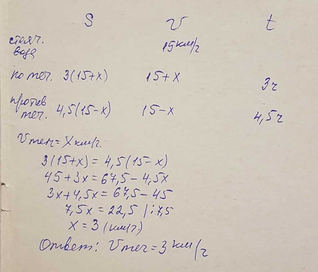 скорость лодки в стоячей воде 15 км ч на путь от пристани a до пристани b по течению реки он тратит 3 ч а на обратный путь 4,5ч какова скорость течения реки ПОМОГИТЕ ПОЖАЛУЙСТА !!!