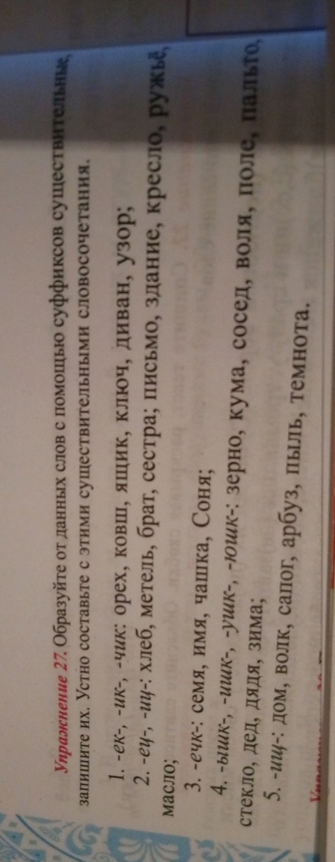 образуйте от данных слов с помощью суффиксов существительные и запишите их устно составьте с этими существительными словосочетания:ек,ик,чик. ковш ящик ключ диван узор