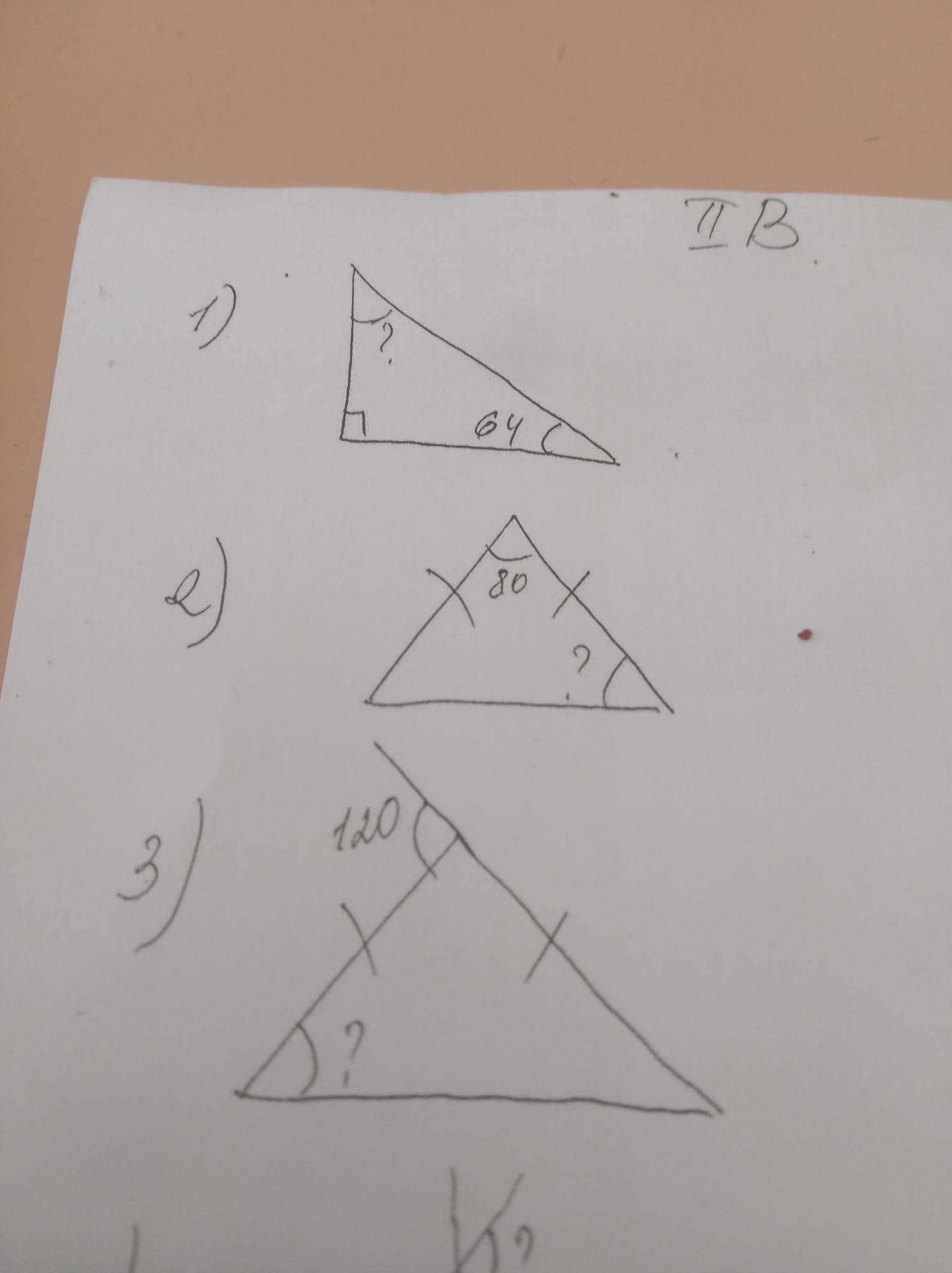 №2. На рисунке угол при вершине равнобедренного треугольника равен 80°. Углы при основании равнобедренного треугольника равны. Поэтому из суммы углов треугольника (180°) каждый из них равен (180°-80°):2=50°