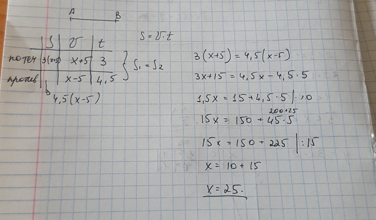 скорость течения реки 5 км ч на путь от пристани а до пристани в по течению реки моторная лодка тратит 3 ч, а на обратный путь 4,5 ч . Какова скорость лодки?