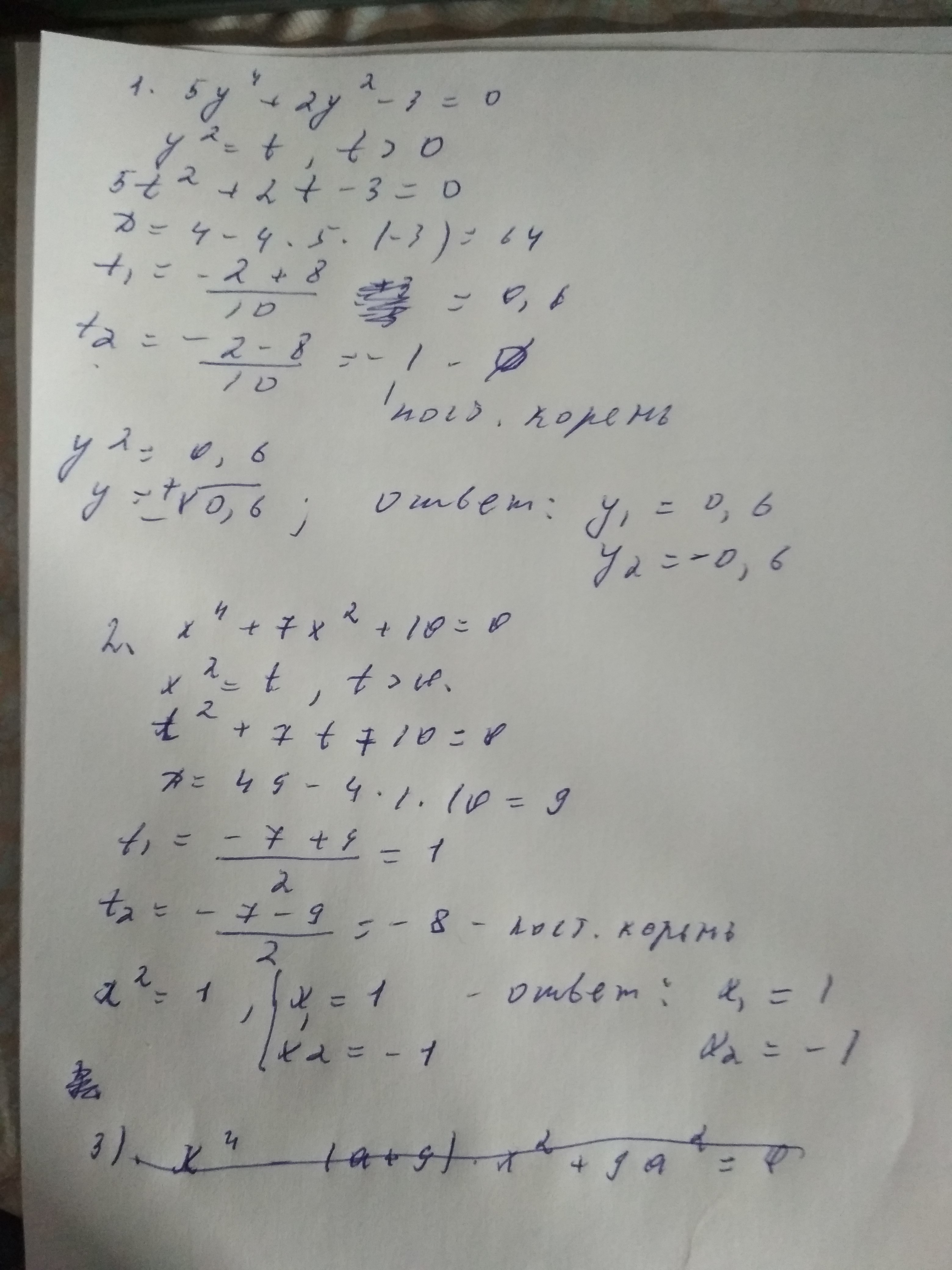 Третье задание не понял. А так уравнения 4ой степени всегда решаются заменой , причем ограничение должно быть , что t больше нуля, потому что корень квадратный из отрицательного числа нельзя вычислить .