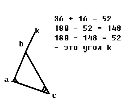 В треугольнике ABC угол BАС равен 36 градусов угол B C A равен 16 градусов Найдите внешний угол AВK этого треугольника