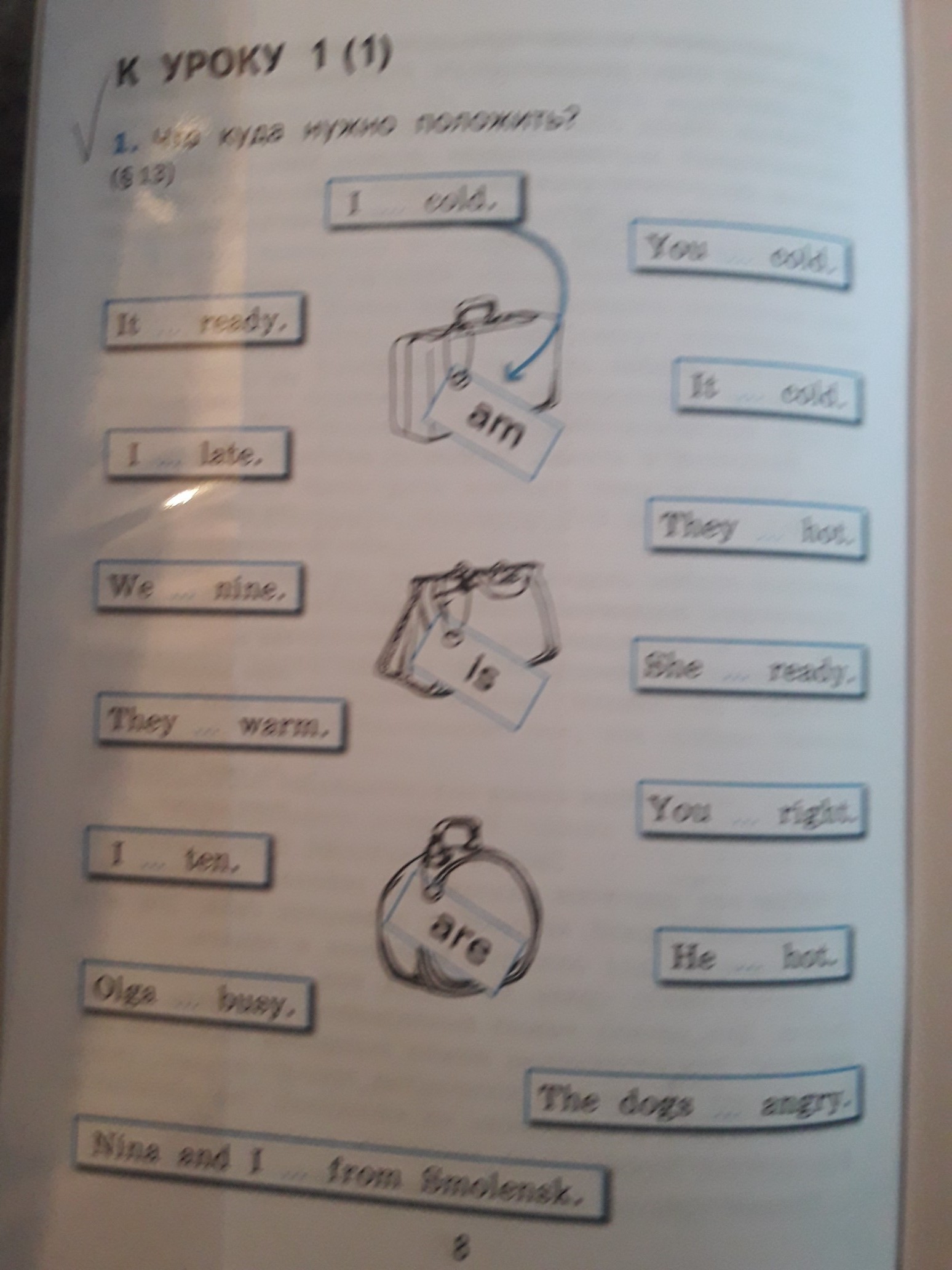 1 I am cold 2 it is ready 3 you are cold 4 I am late 5 it is cold 6 you are right 7 we are nice 8 they are warm 9 Olga is busy 10 she is ready 11 he is hot 12 the dogs are angry 13 Nina and I are from Smolensk.