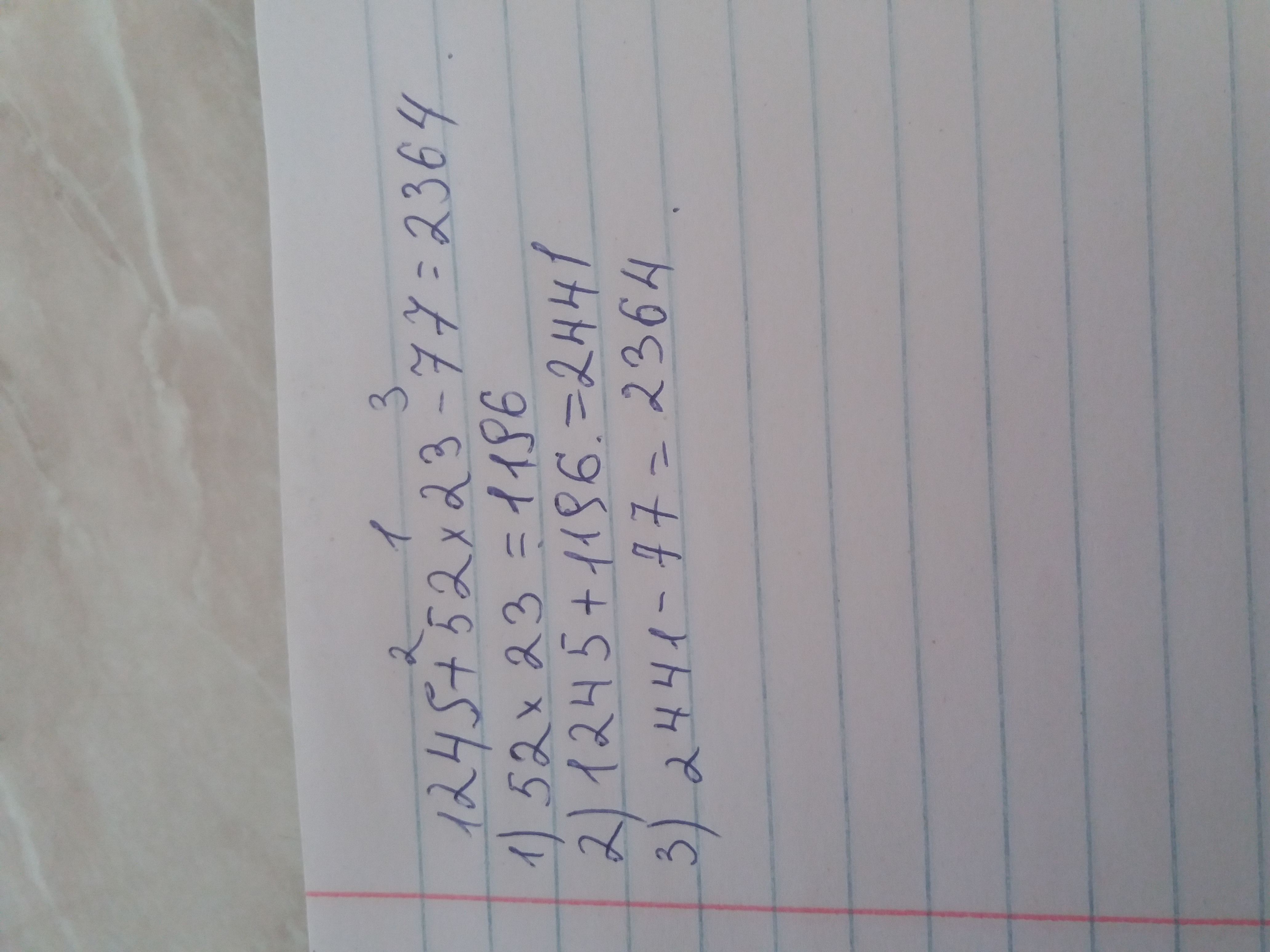 1)52×23=1196 2)1245+1196=2441 3)2441-77= 2364