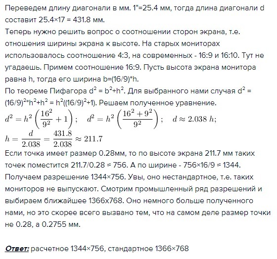 определить максимально возможную разрешающую способность экрана для монитора с диагональю 17 дюймов и размером точки экрана 0,23мм
