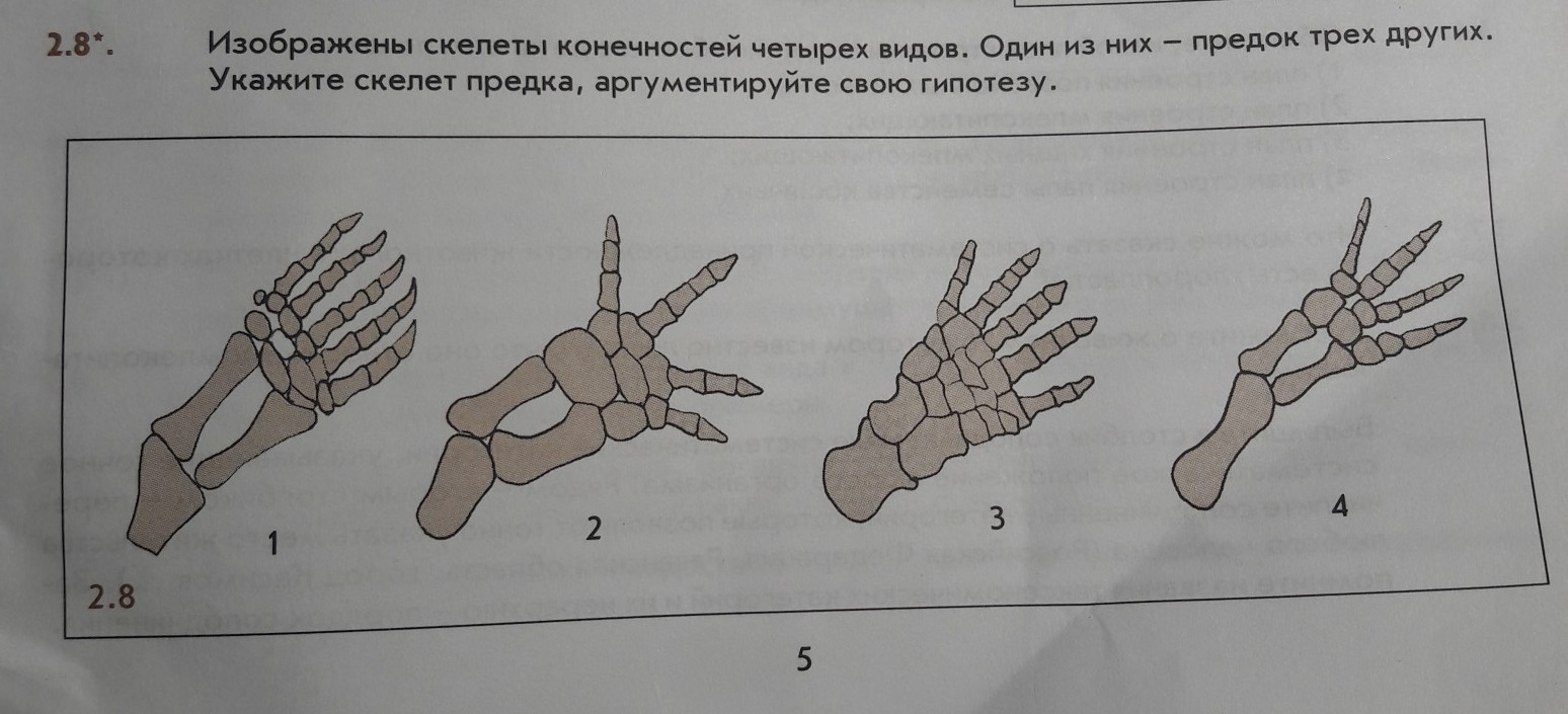Изображены скелеты конечностей четырёх видов. Один из них - предок других трёх. Укажите скелет предка, аргументируйте свою гипотезу.