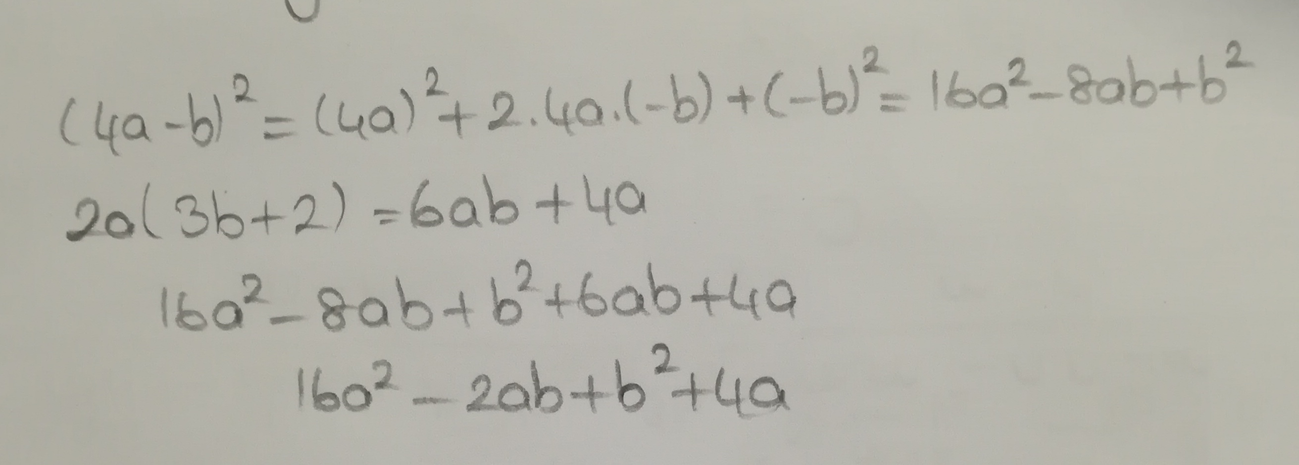 (4a-b)^2+2a(3b+2)=16a^2-8ab+b^2+6ab+4a=16a^2-2ab+b^2+4a