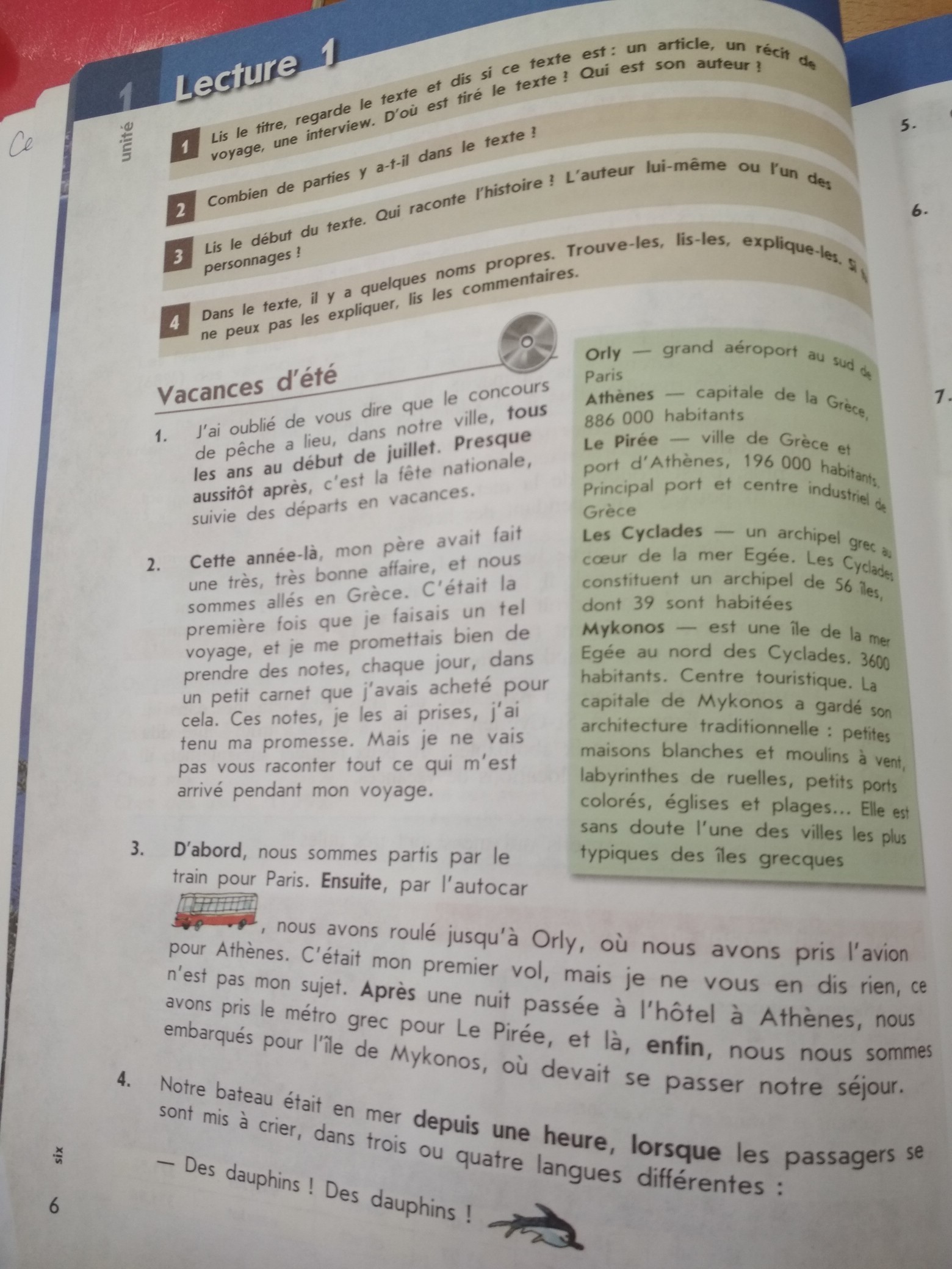 Сначала мы приехали на поезде в Париж. Затем, на машине мы доехали до Орлая, где мы сели на самолет в Афины. Это был мой первый полет, но я вам про это ничего не скажу, это не моя тема. После проведенной ночи в отеле в Афинах, мы сели на греческое метро до Пире, и вот наконец мы производим посадку (на корабль) до острова Миконос, где должны провести наше пребывание.