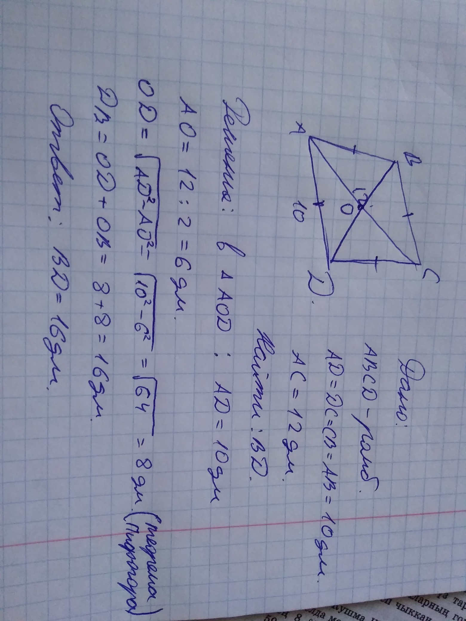 Найдите диагональ ромба, если сторона ромба равна 10 дециметров, а другая диагональ 12 дециметров.