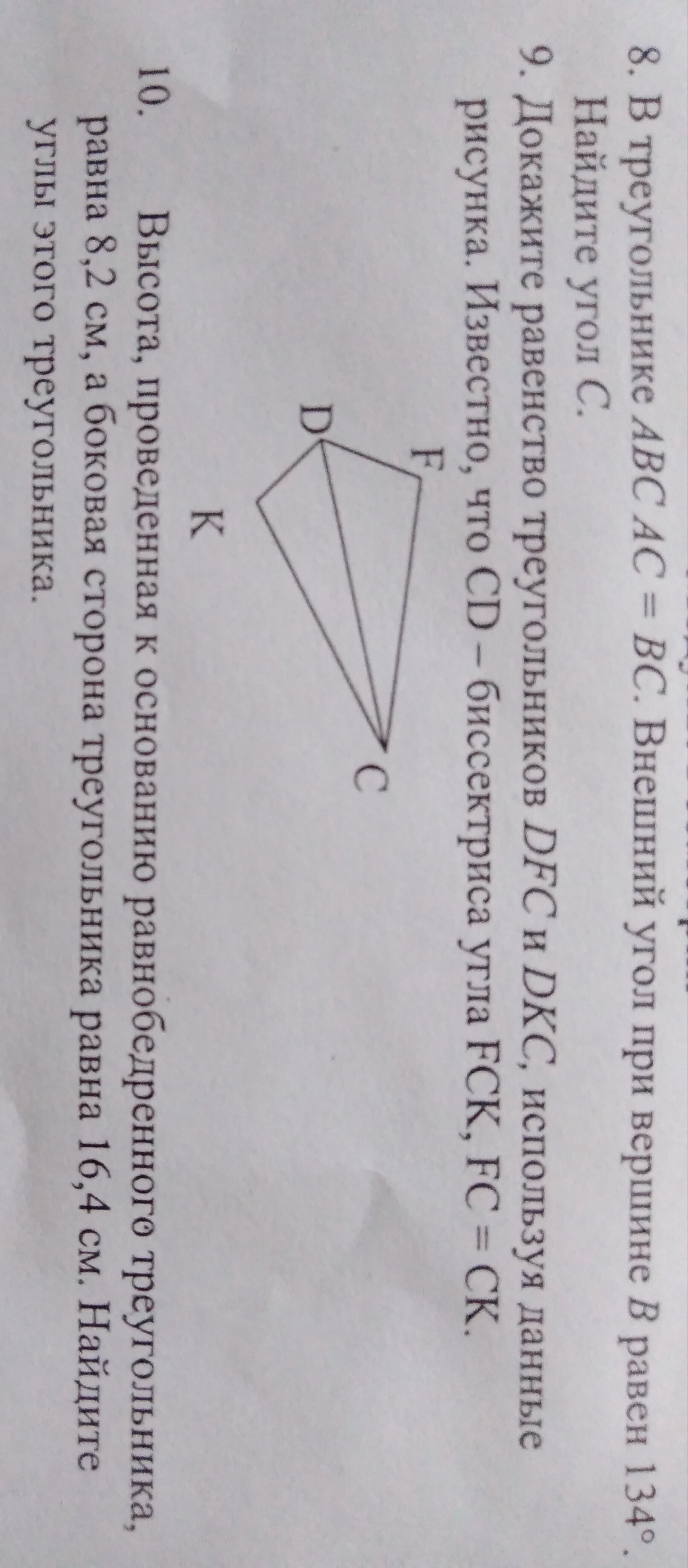 8 Если две сторонв треугольника равны это равнобедренный треугольникнеугомонно. в нашем случае основание треугольника сторона АВ. найдем угол В у основания. Этот угол смежный с внешним углом при вершине В. угол В у основания равен 180-134=46. Так как углы у основания равнобедренного треугольника равны угол В равен углу А. сумма углав треугольника равна 180. угол С равен 180-46-46=88 9 Треугольники равны по двум сторонам и углу между ними KC=FC по условию CD общая угол KCD = углу FCD так как поусловию CD биссектриса угла KCF а биссектриса делит угол пополам 10 Т.к. высота является катетом образовавшегося прямоугольного треугольника и в два раза меньше стороны которая является гипотенузой образовавшегося прямоугольного треугольника, то угол лежащий против высоты катета у основания равнобедренного треугольника равен 30гр. т.к. треугольник равнобедренный то второй угол у его основания тоже 30гр. находим третий угол. он равен 180-30-30=120гр