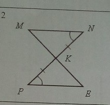 Треугольники равны по стороне и двум прилежащим к ней углам PK и NK равны по условию Угол MNKи EPK равны по условию Углы MKNиEKP равны как вертикальные